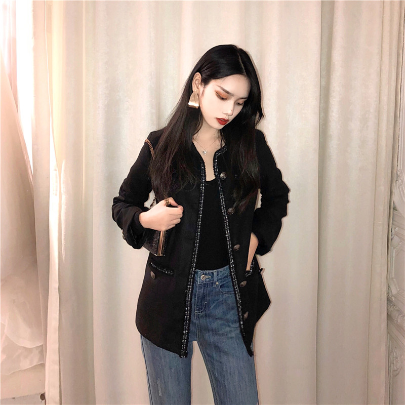 韓國復古時尚氣質修身短款呢子外套+高腰加厚不規則毛邊牛仔褲女