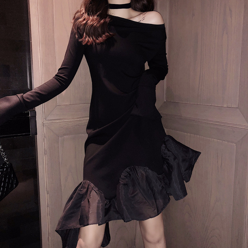 / 韓版時尚女秋裝2018新款裙子氣質拼接網紗波點長袖黑色魚尾連衣裙