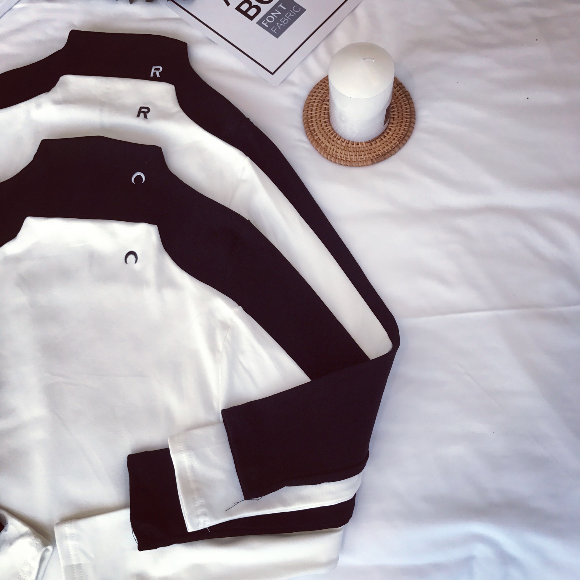 冬裝上衣女慵懶長袖t袖女月亮刺繡打底字母半高領加薄絨百搭打底