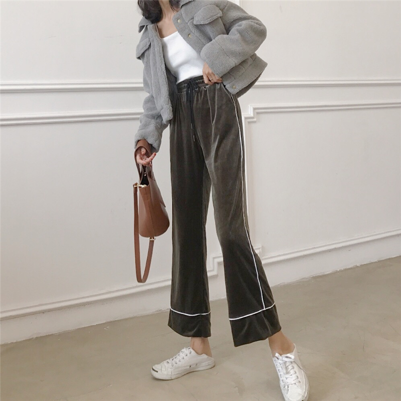 / 秋季chic韓版新潮百搭直筒高腰松緊腰系帶白條絲絨闊腿褲休閑長褲