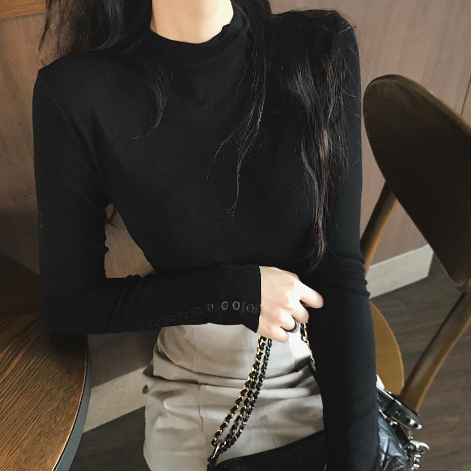 / 新款小立領修身扣子裝飾打底衫正反兩穿不規則高腰半身裙時尚套裝