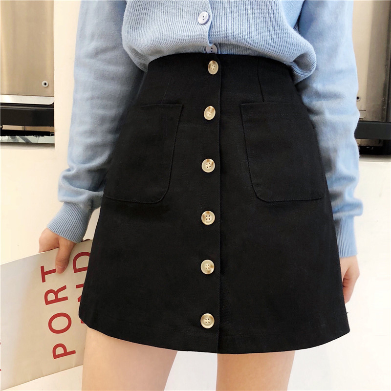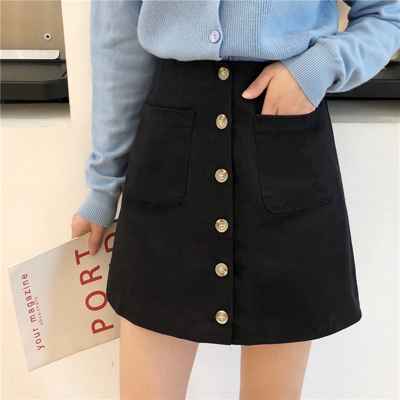 / 短裙女秋冬裝2018新款韓版高腰顯瘦雙口袋鈕扣A字裙包臀半身裙子