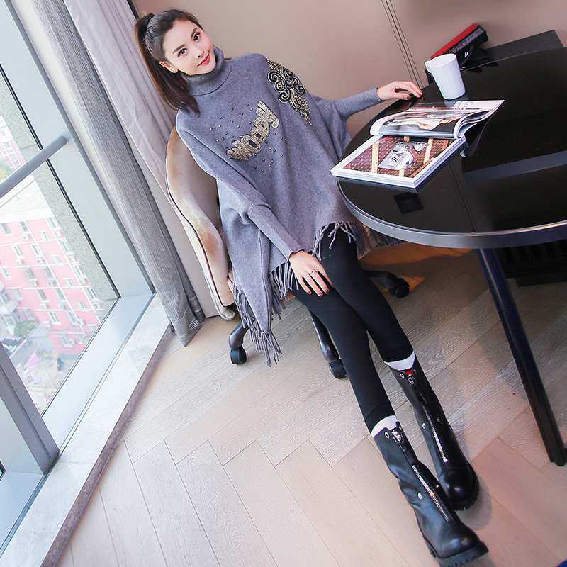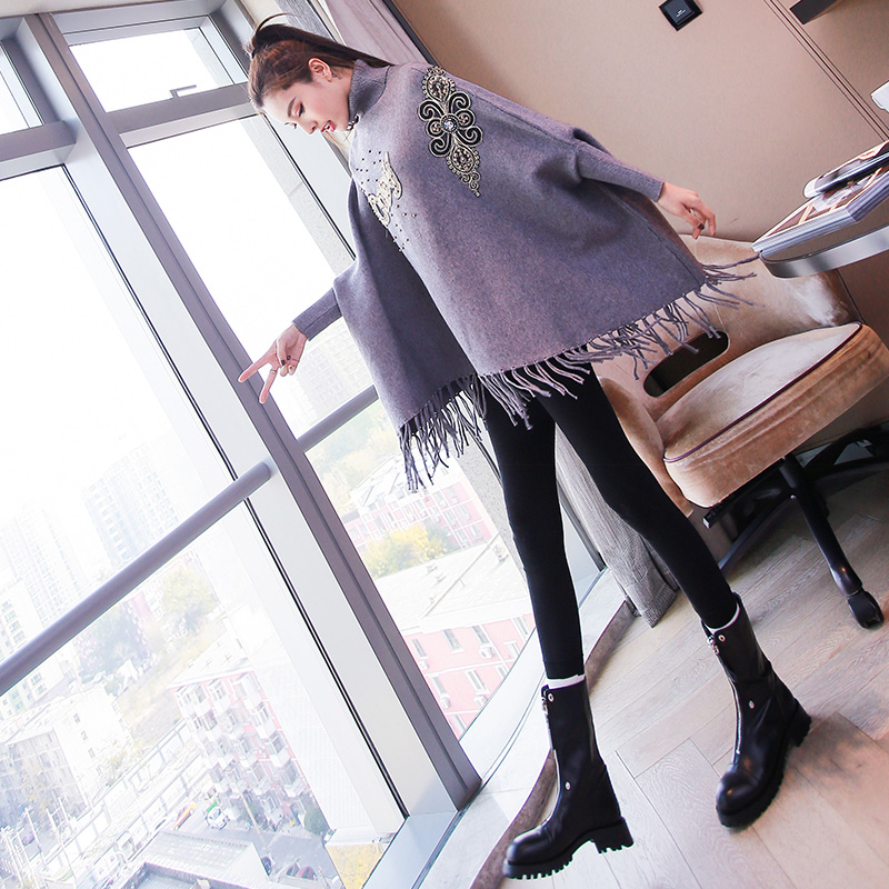 2018秋冬季新款流蘇針織衫斗篷披肩蝙蝠袖外套中長款套頭毛衣女裝
