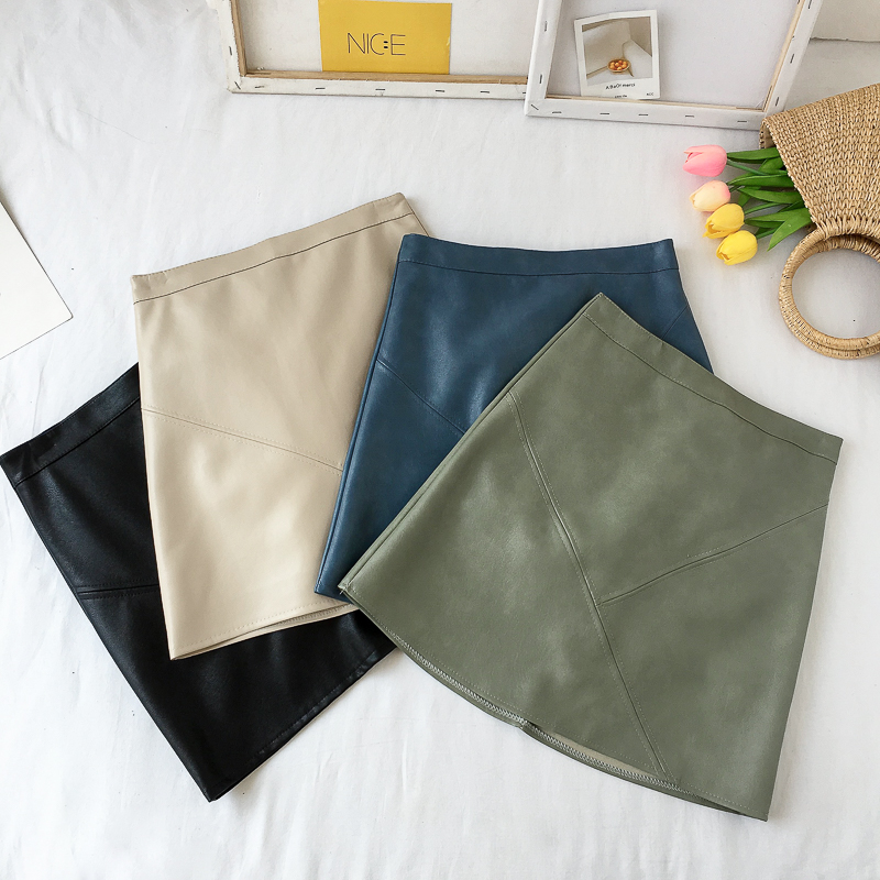 / 秋季新款韓版高腰時尚復古chic百搭拼接pu皮短裙潮半身裙A字裙女