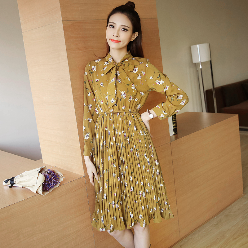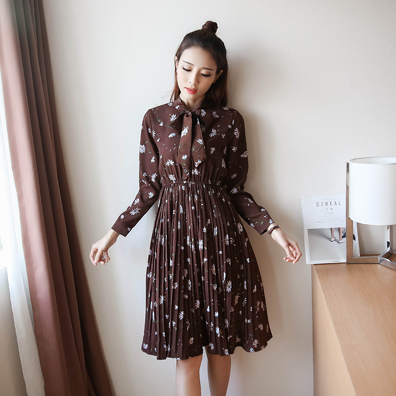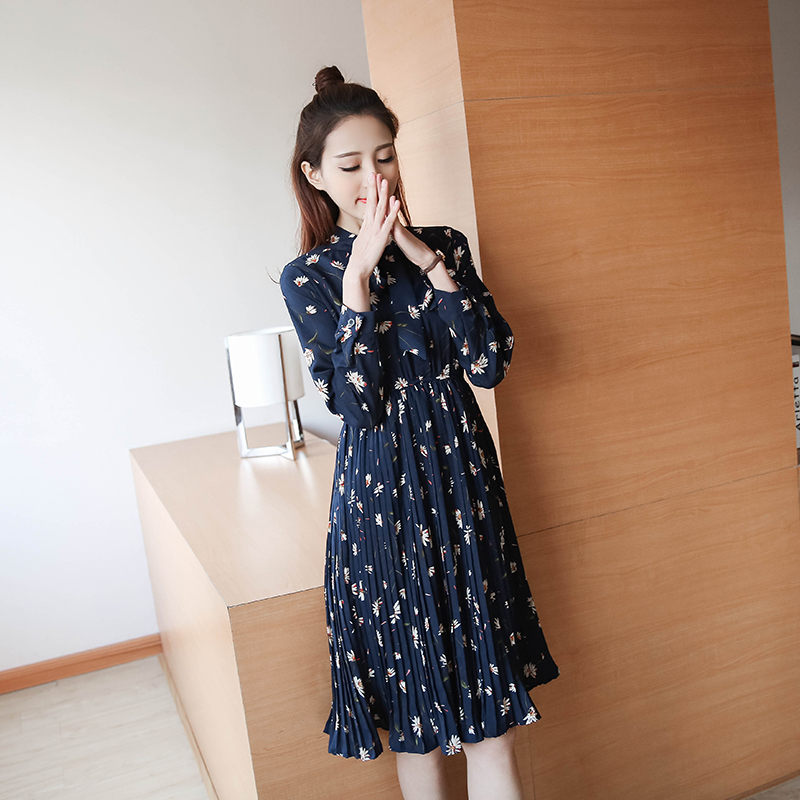 / 春新款女裝復古印花中長款打底裙收腰顯瘦碎花長袖連衣裙春秋
