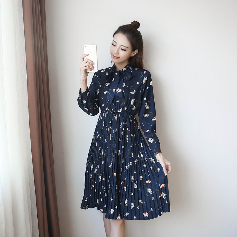春新款女裝復古印花中長款打底裙收腰顯瘦碎花長袖連衣裙春秋