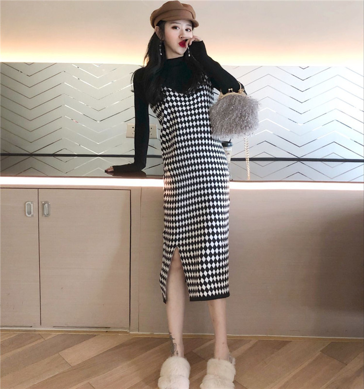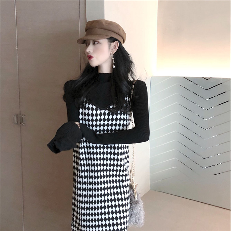 / 套裝女秋韓版氣質修身顯瘦半高領打底衫開叉格子吊帶長裙兩件套潮