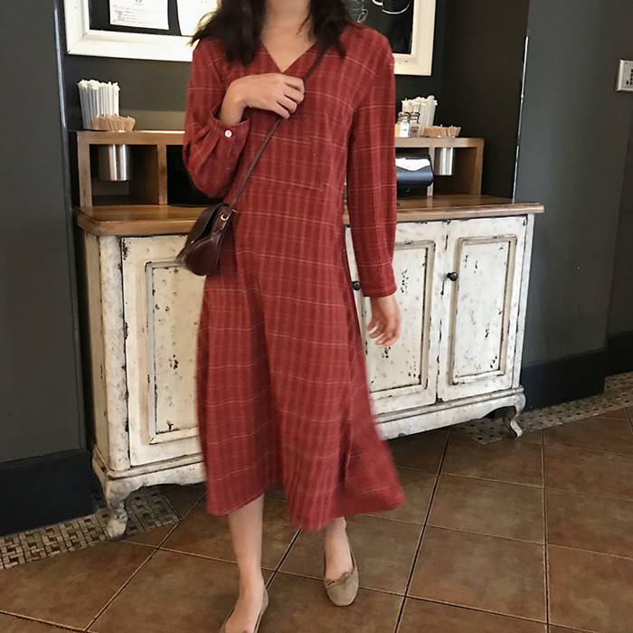 / 2018新款秋季女裝韓版復古氣質中長款格紋v領長袖連衣裙顯瘦長裙