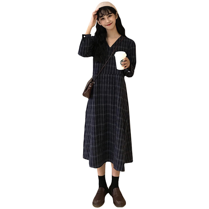 2018新款秋季女裝韓版復古氣質中長款格紋v領長袖連衣裙顯瘦長裙