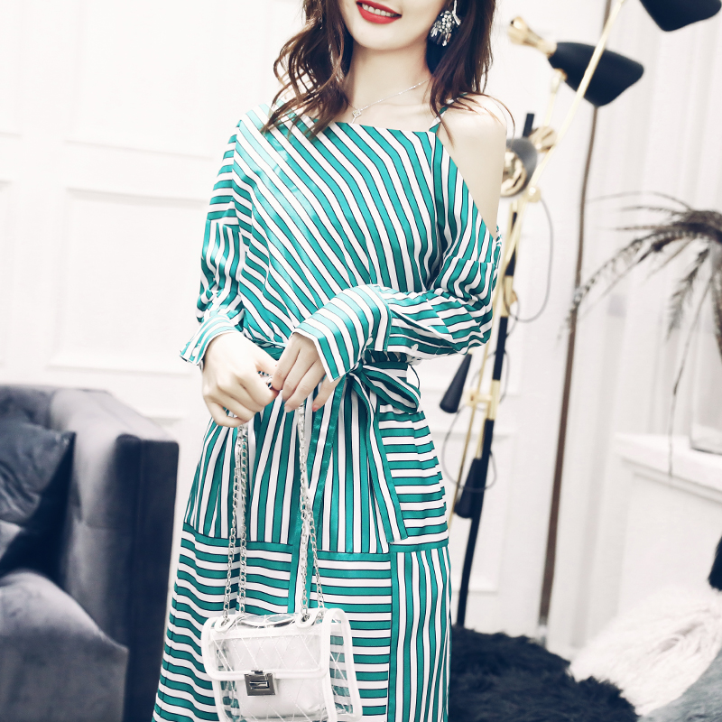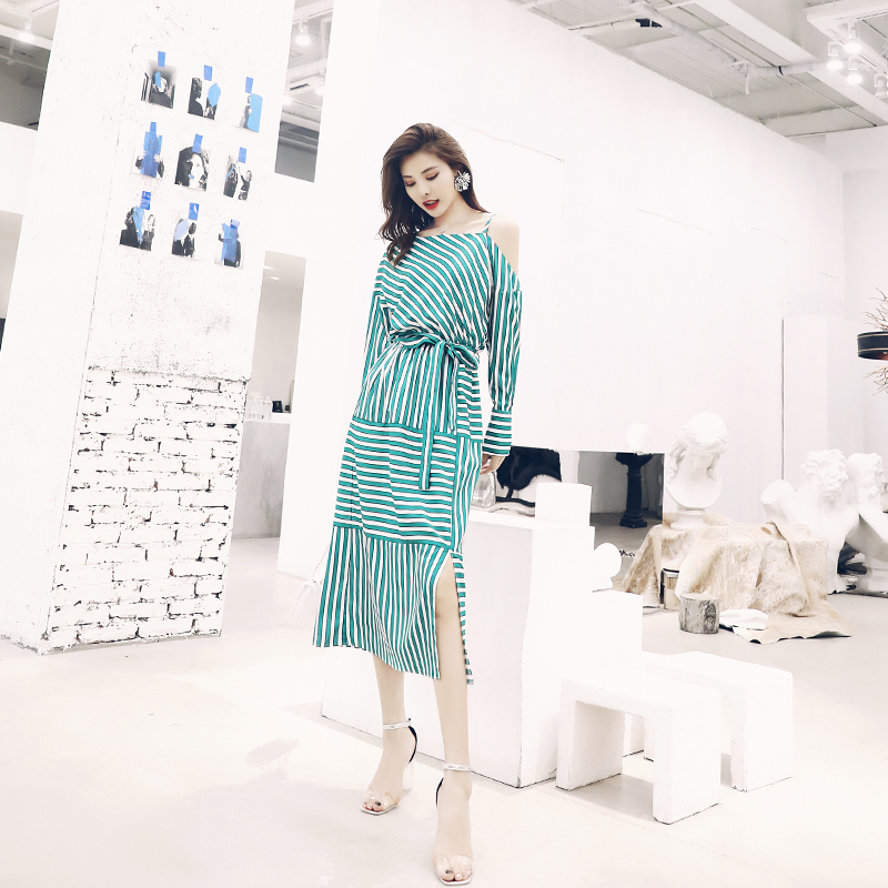 / 慵懶風港味連衣裙女2018新款夏中長條紋氣質顯瘦收腰露肩襯衣裙子