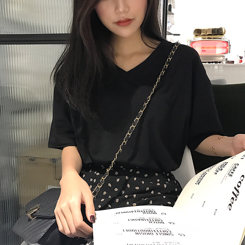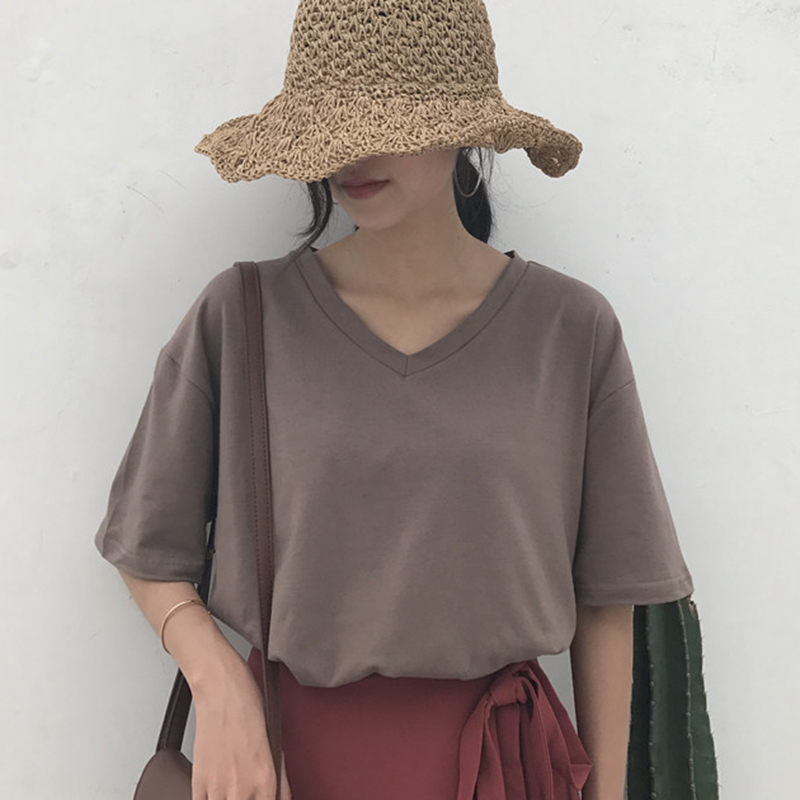 夏季新款女裝韓版chic風寬松V領純色短袖打底衫甜美百搭學生t恤女