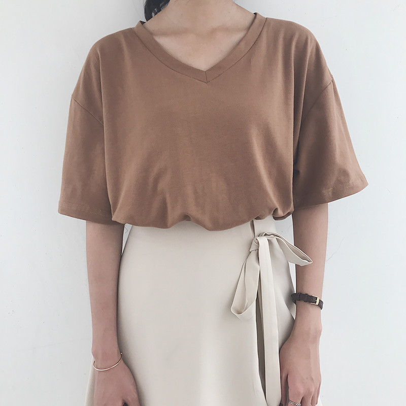 / 夏季新款女裝韓版chic風寬松V領純色短袖打底衫甜美百搭學生t恤女