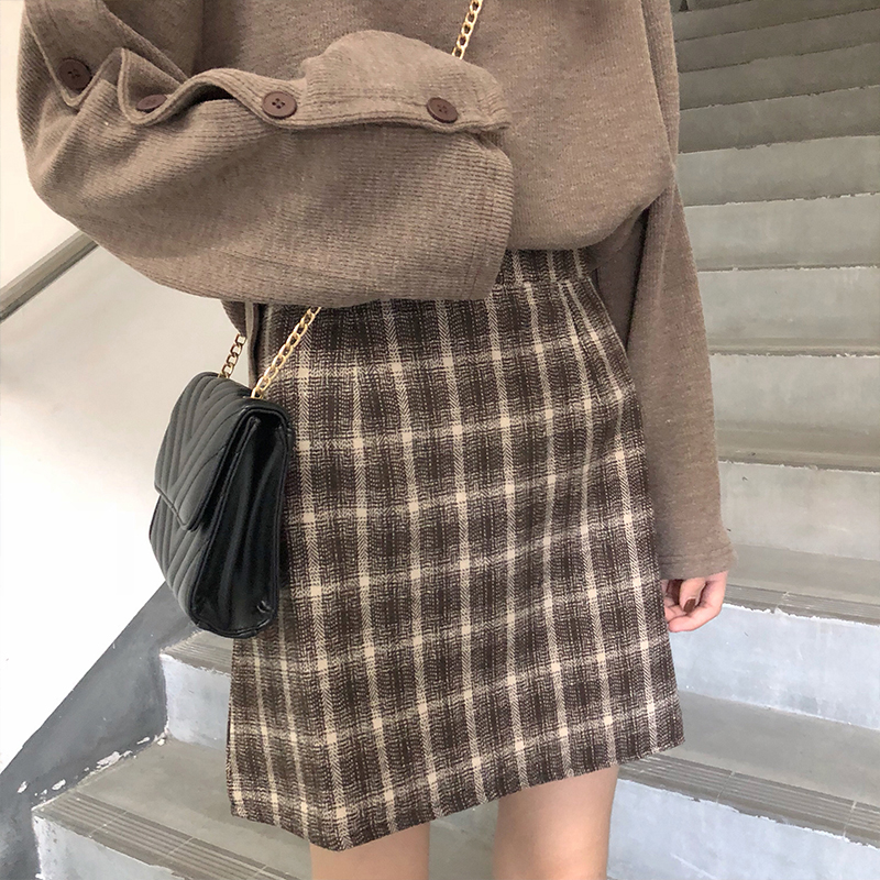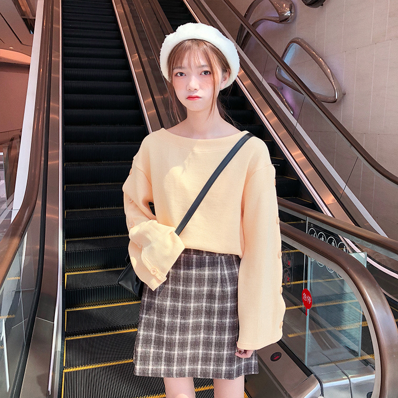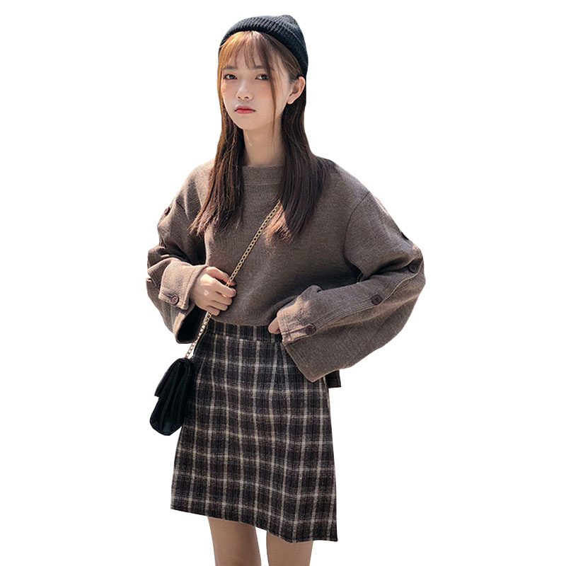 / 韓版時尚休閑套裝秋季女裝排扣針織衫衛衣+格子呢子半身裙兩件套