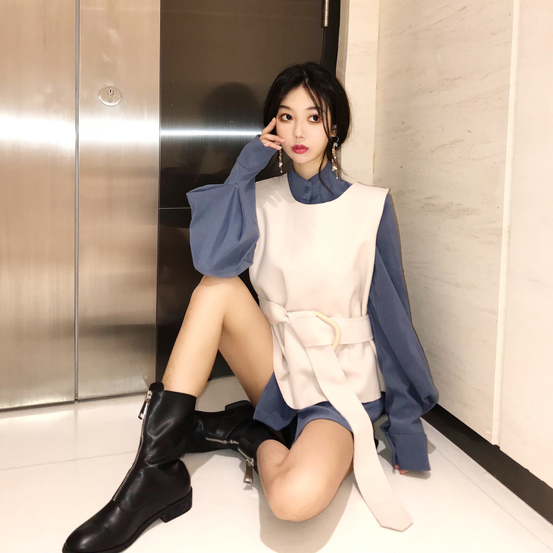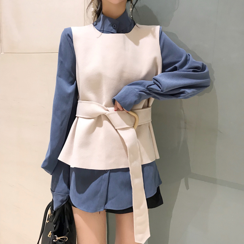/ 秋裝新款韓版時尚套裝女上衣泡泡袖襯衫女裝長袖馬甲兩件套襯衫潮