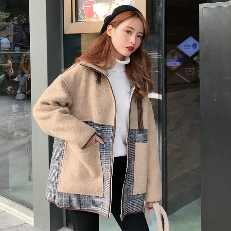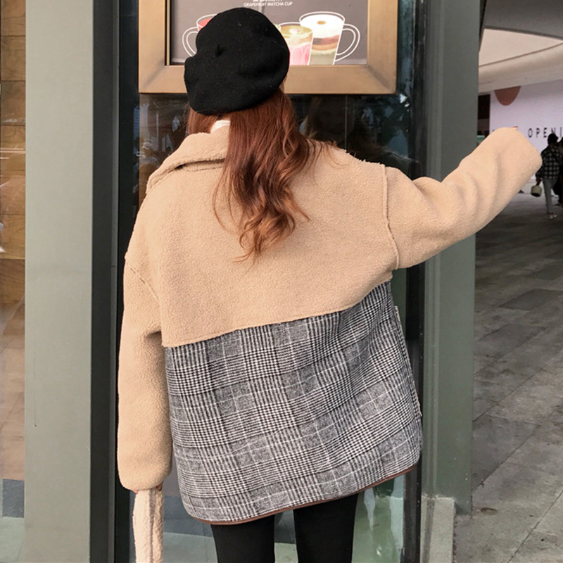 秋冬女裝2018新款韓版格子拼接羊羔毛外套學生寬松立領毛呢開衫潮