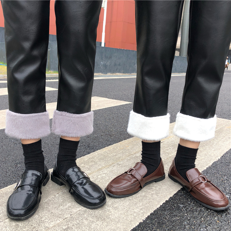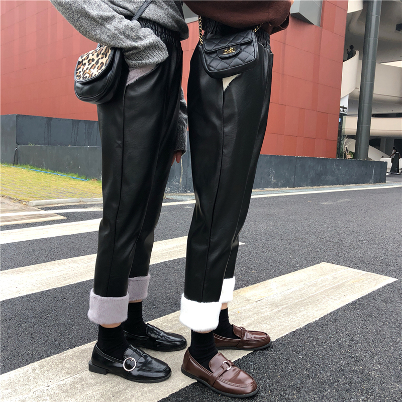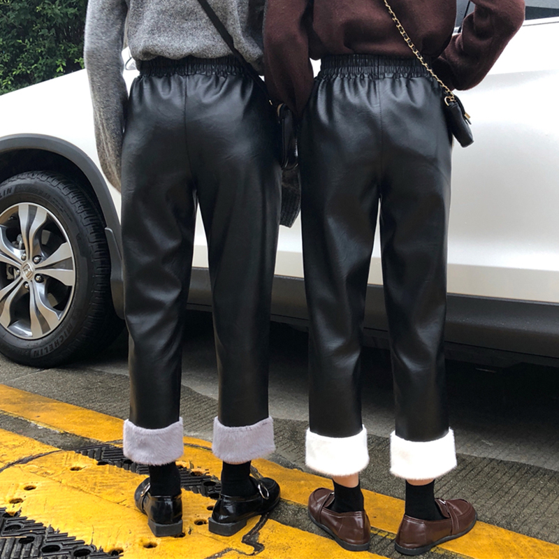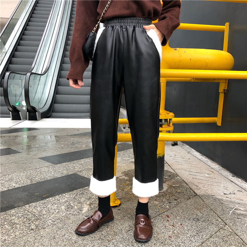 / 黑色寬松加絨休閑褲子女秋冬裝新款高腰顯瘦拼接毛絨PU皮九分褲潮