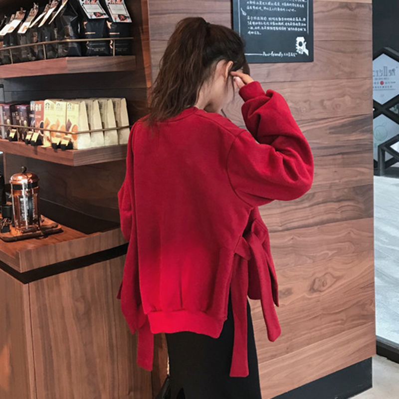 / 個性開叉系帶加絨衛衣秋冬2018女裝新款圓領外套學生寬松長袖上衣