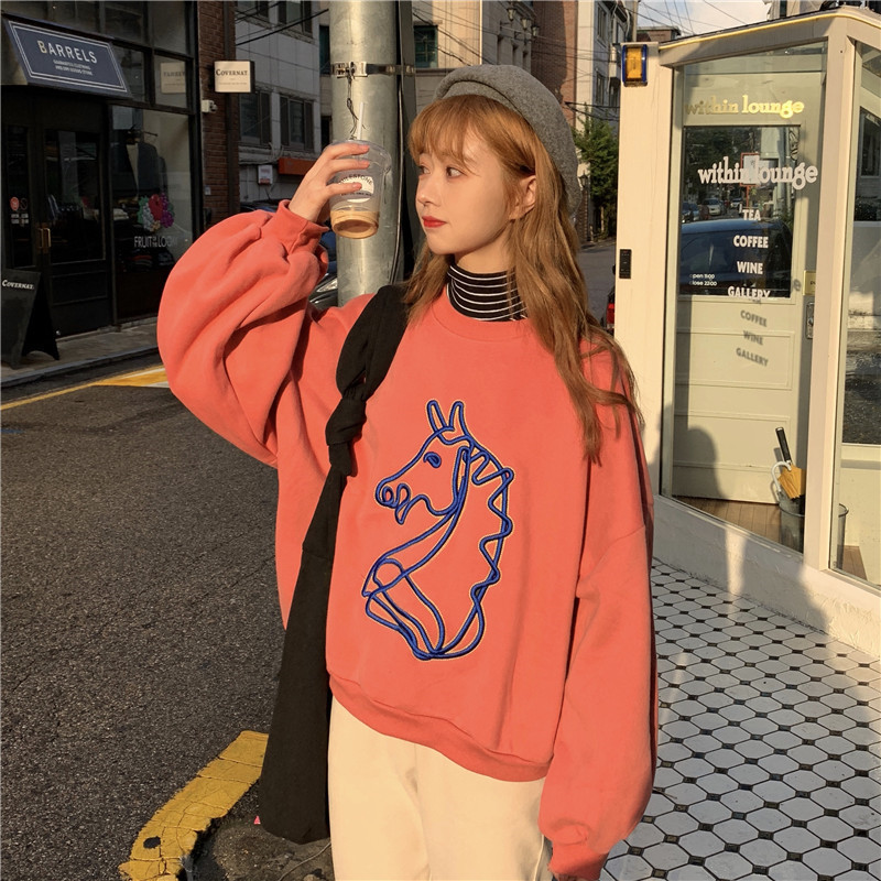 2018新款秋冬韓版寬松慵懶風小馬刺繡加絨加厚套頭衛衣上衣外套女