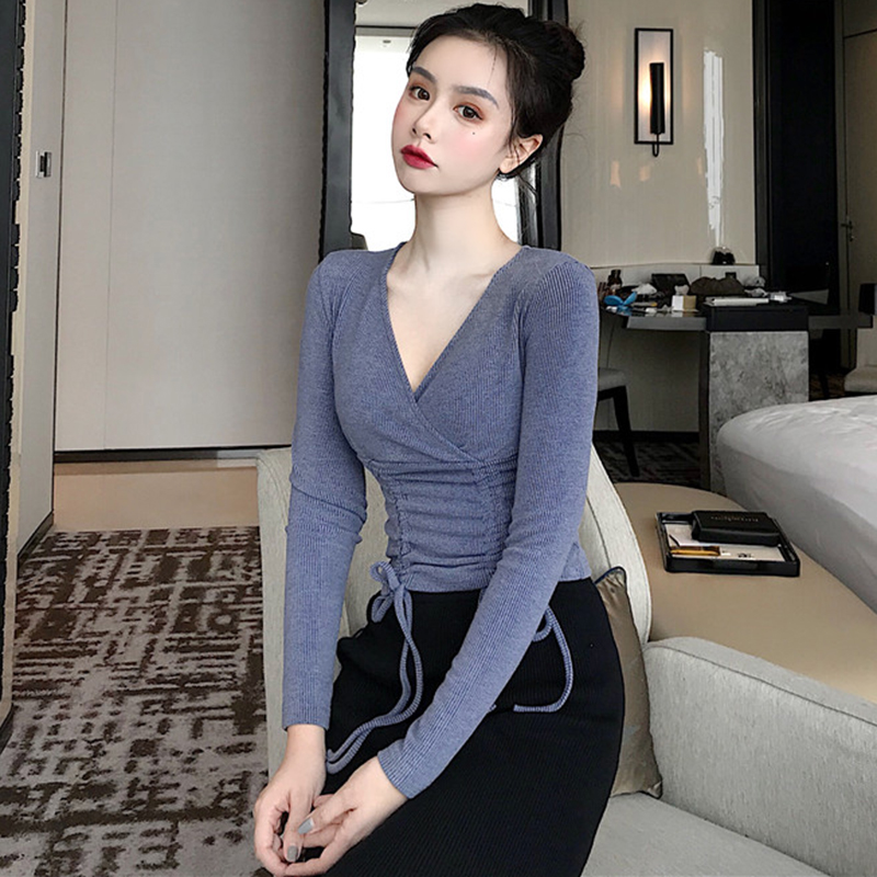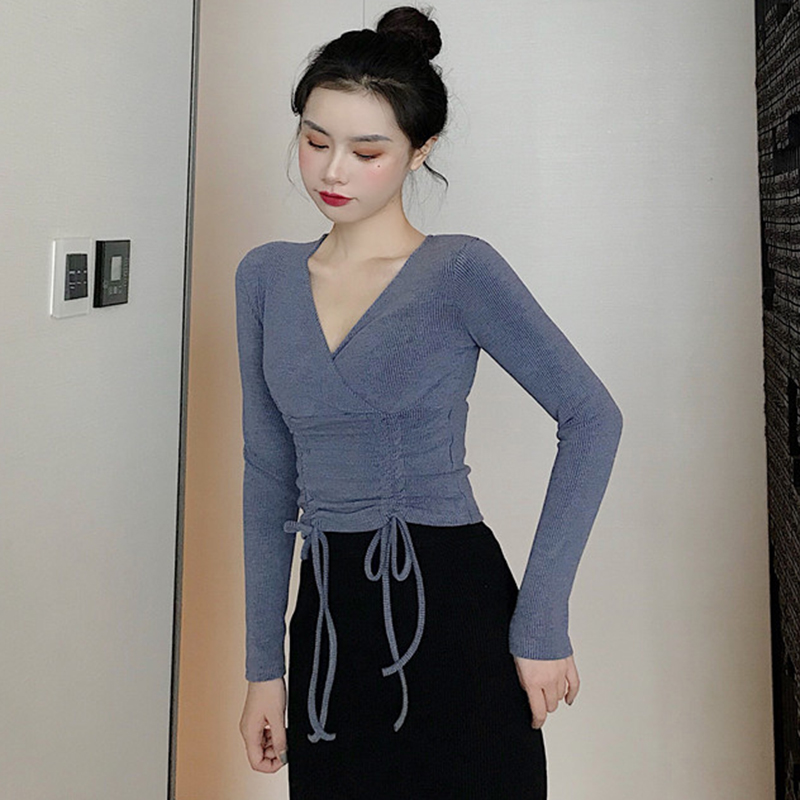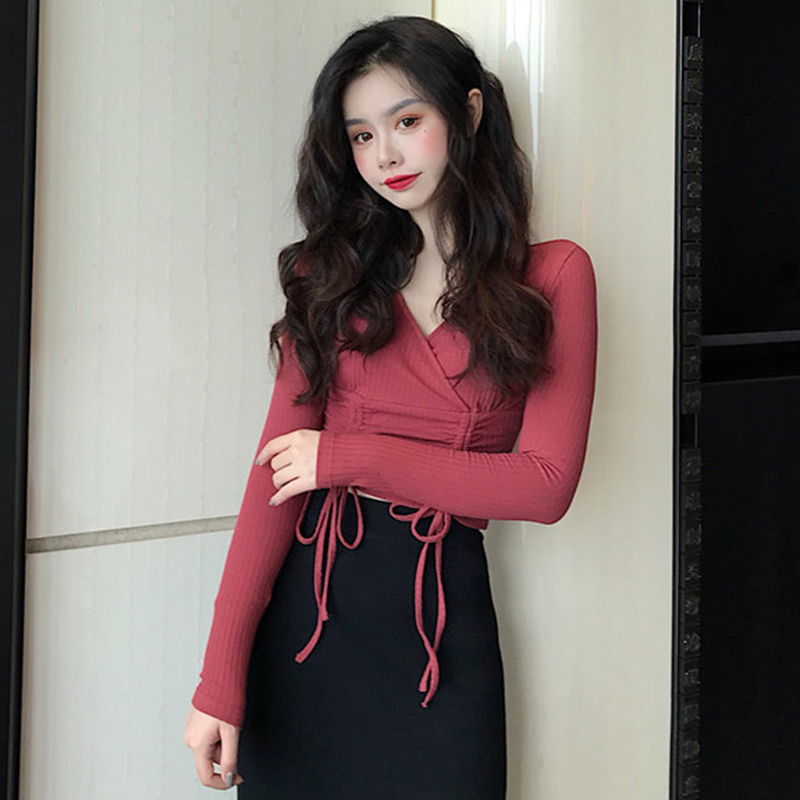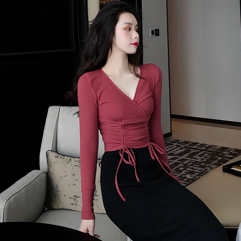 / 時尚抽繩修身顯瘦長袖打底衫女秋冬裝新款韓版心機V領短款T恤上衣