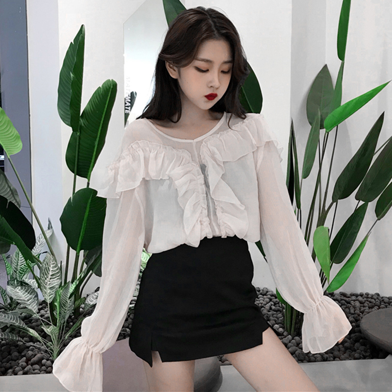 早秋2018新款女韓版黑色氣質荷葉邊V領防曬衫寬松燈籠袖雪紡上衣