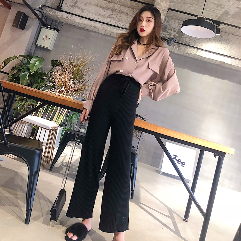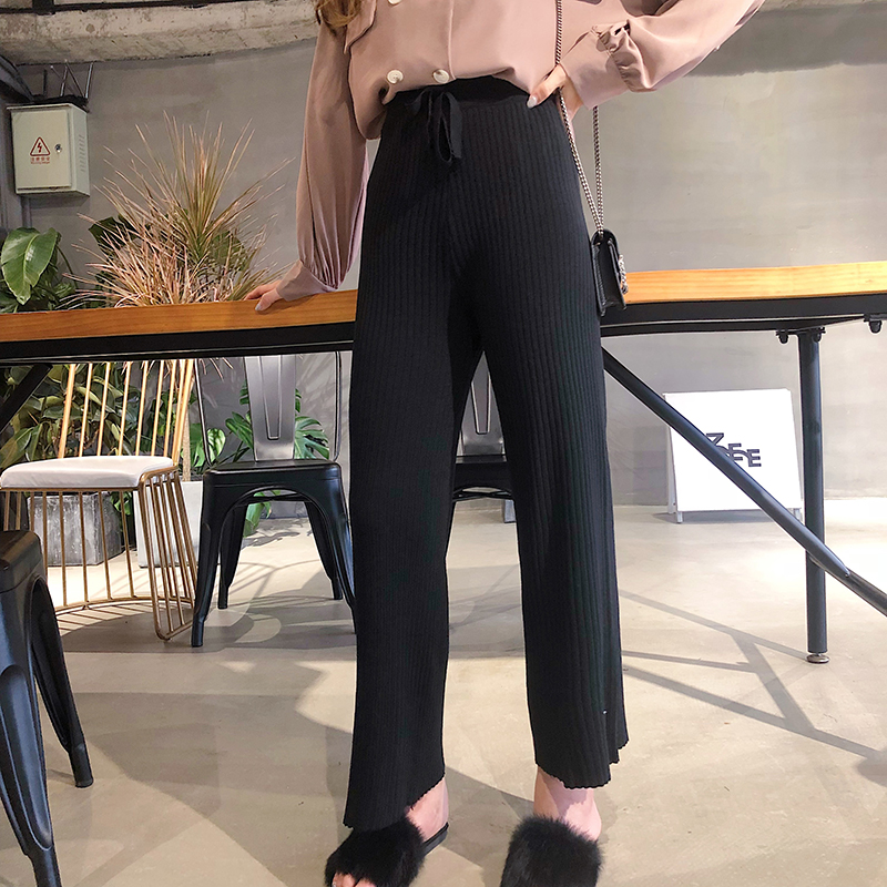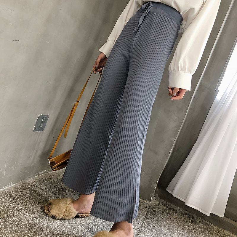 港味女秋裝2018新款復古風修身顯瘦高腰系帶針織直筒百搭闊腿褲潮