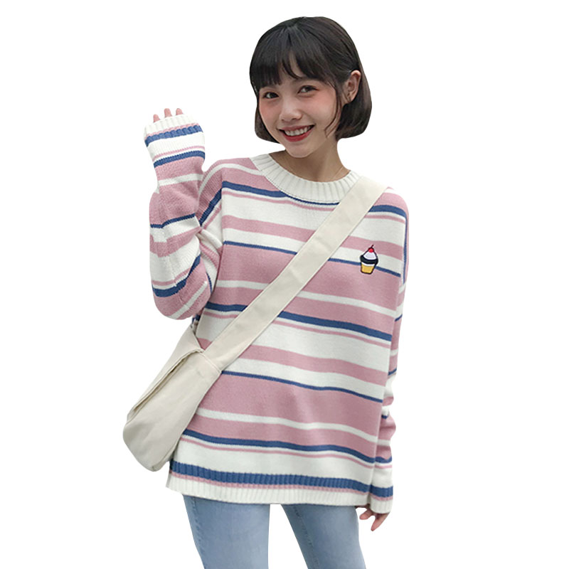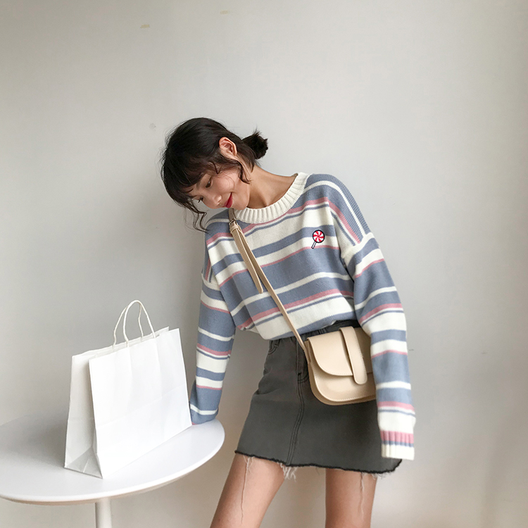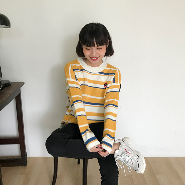/ 秋季女裝韓版慵懶風寬松拼色條紋卡通刺繡網紅套頭針織衫毛衣外套