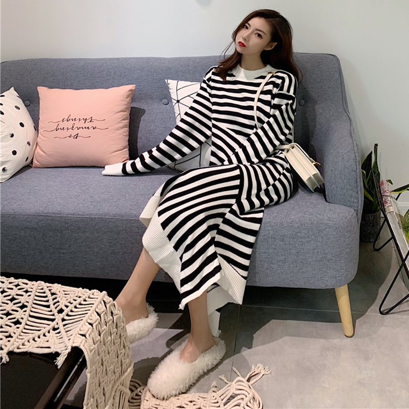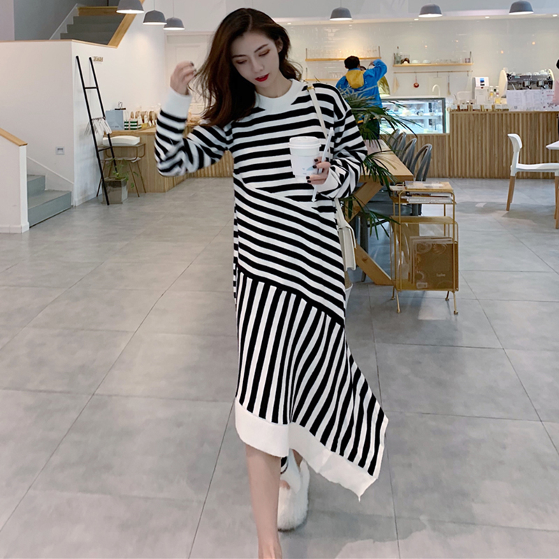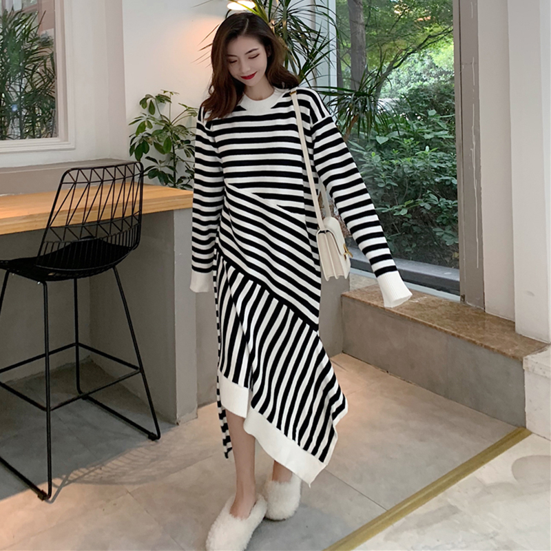 / 氣質復古風不規則條紋長袖針織連衣裙秋冬裝新款法式少女茶歇裙子