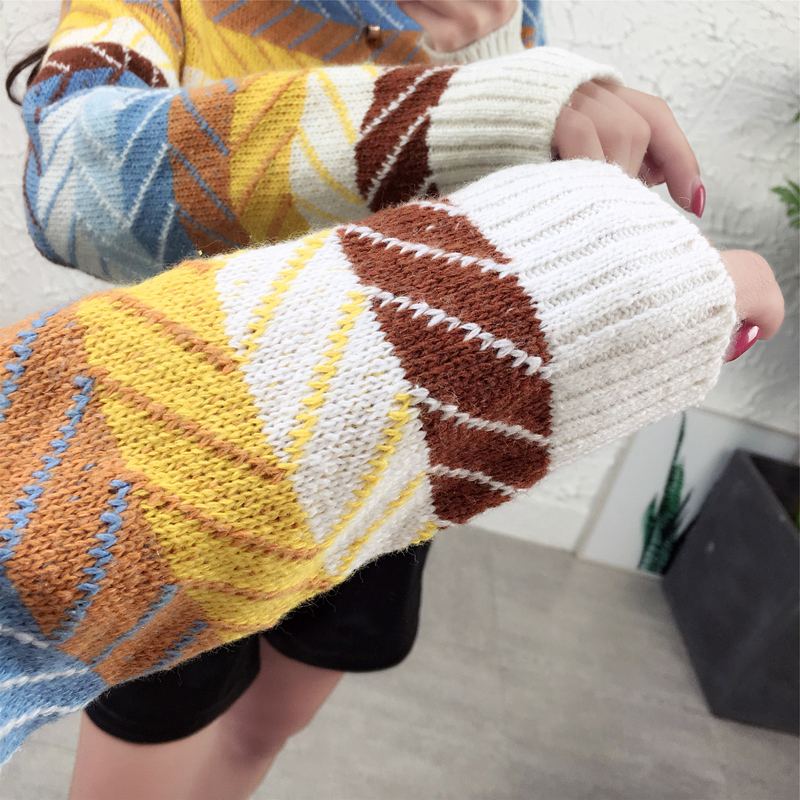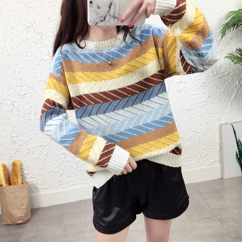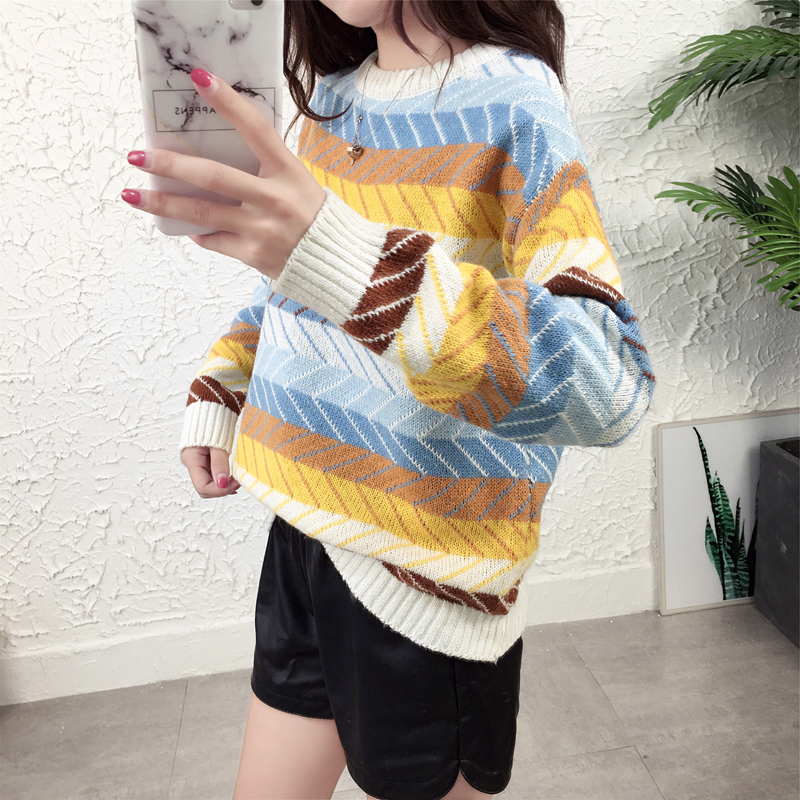 / 學生撞色毛衣外套女秋冬裝2018新款韓版百搭寬松長袖套頭針織衫潮