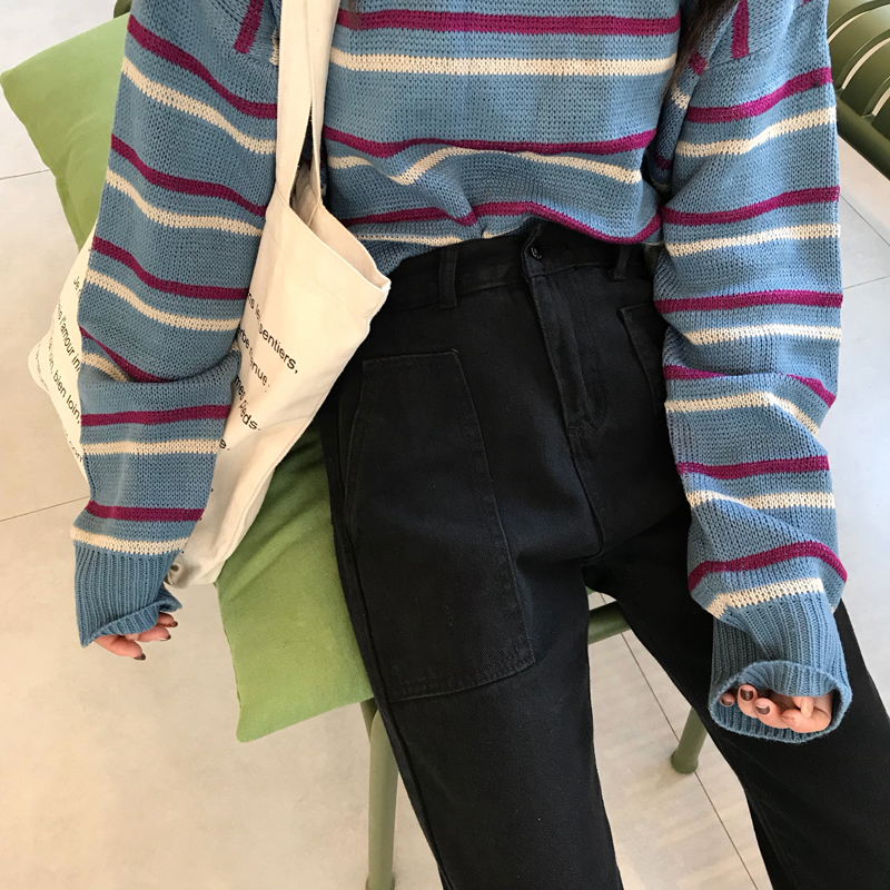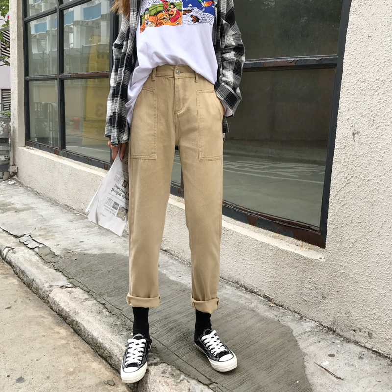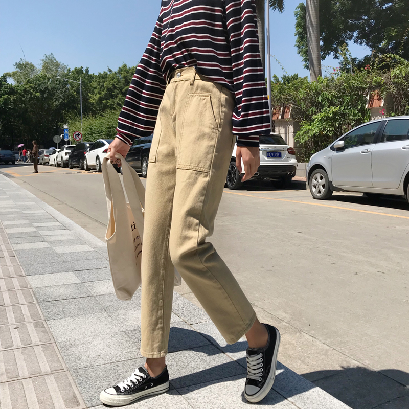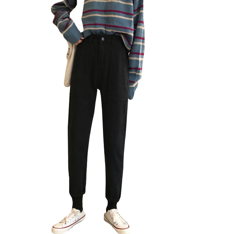 / 秋季韓版松緊腰雙口袋黑色牛仔褲高腰顯瘦直筒褲九分褲學生褲子女