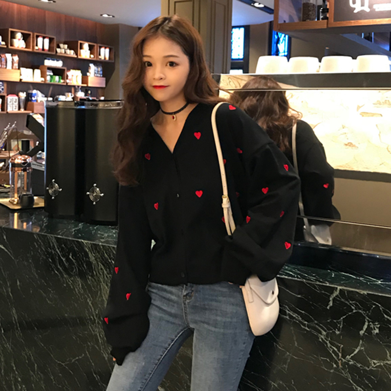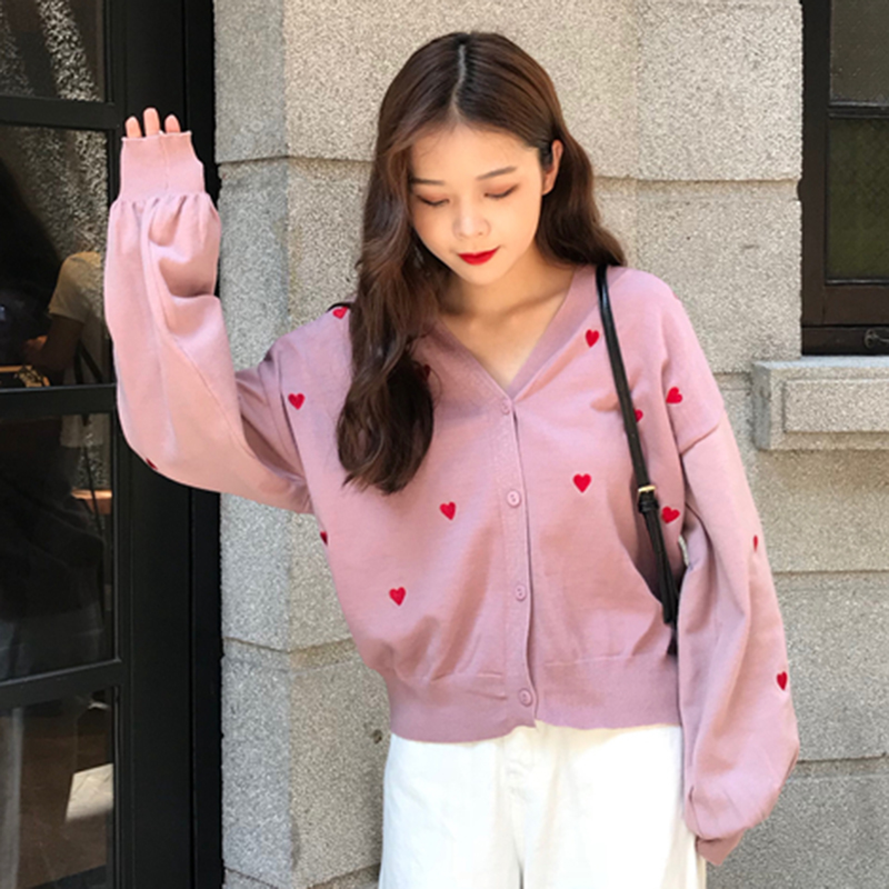 / 甜美少女愛心刺繡慵懶針織開衫秋裝新款學生寬松V領燈籠長袖上衣