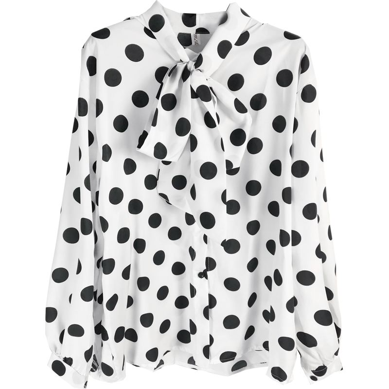 / 秋新款成熟風氣質冷系女裝蝴蝶結白色波點長袖系帶雪紡襯衫女