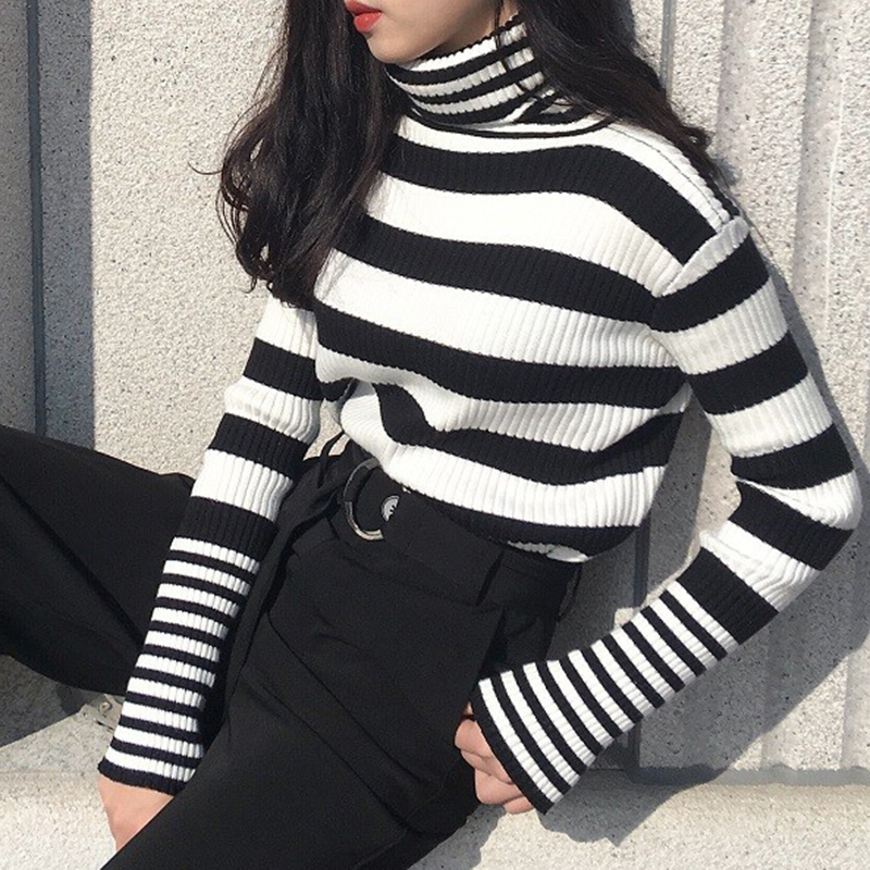 毛衣女秋冬裝2018新款時尚高領學生條紋打底針織衫休閑長袖上衣潮
