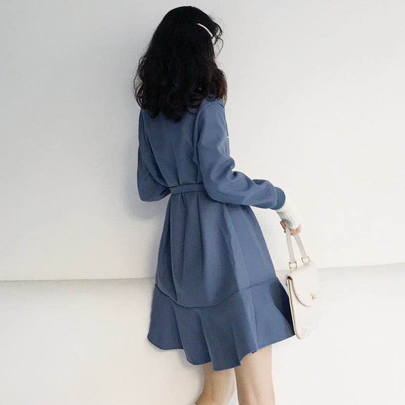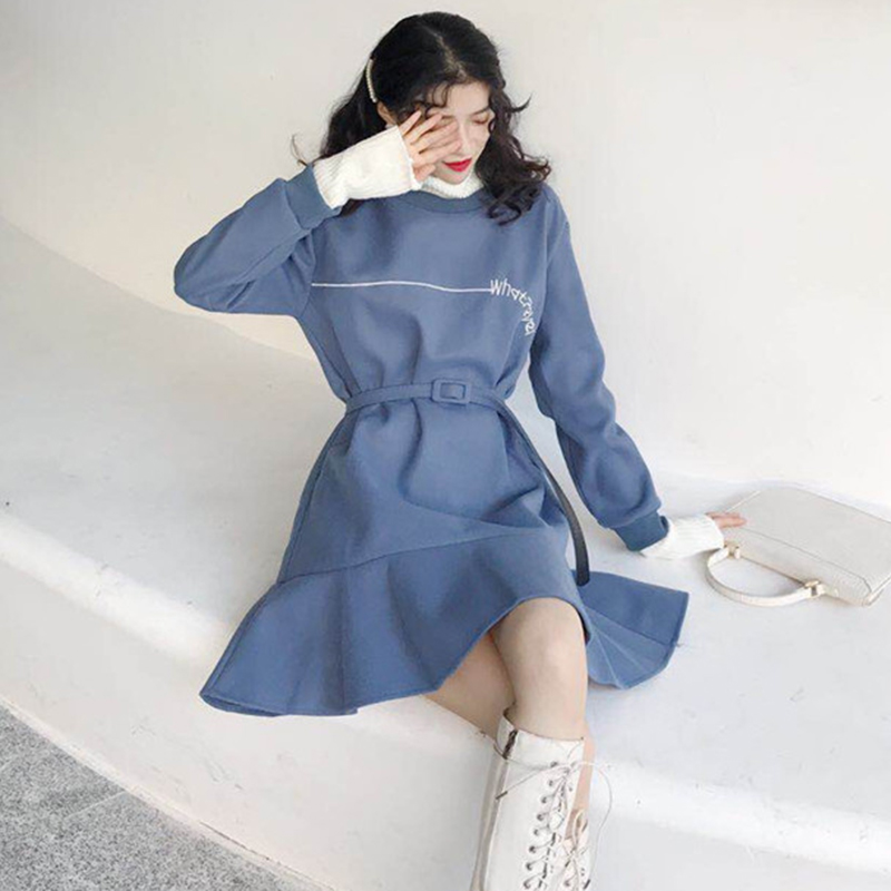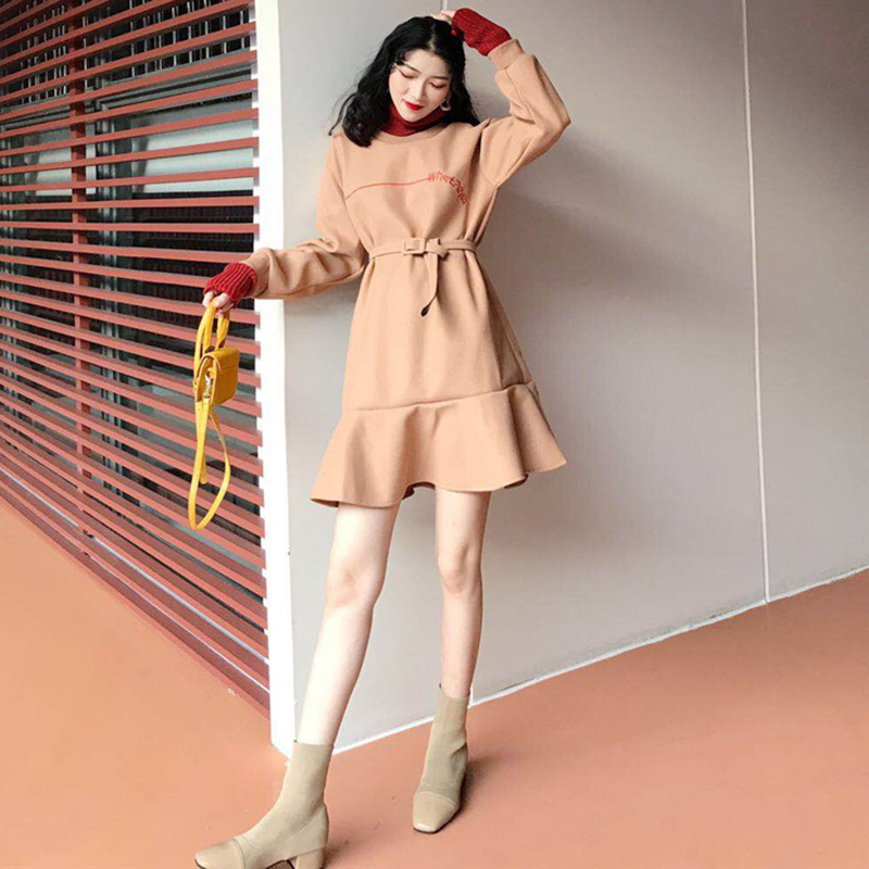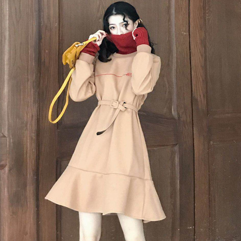 / 復古撞色拼接高領長袖連衣裙子秋冬裝新款法式少女egg魚尾桔梗裙
