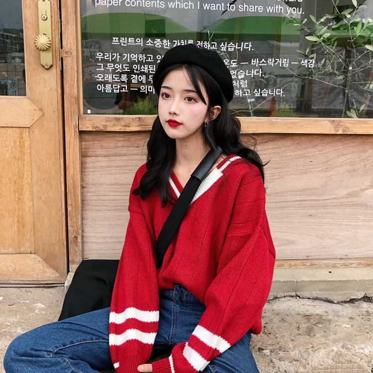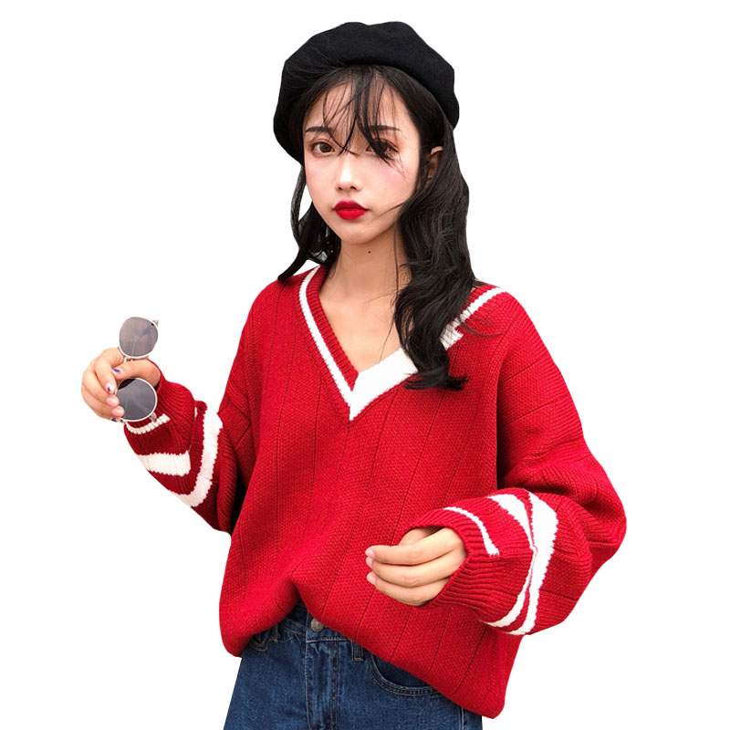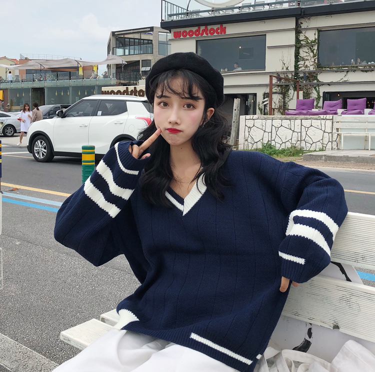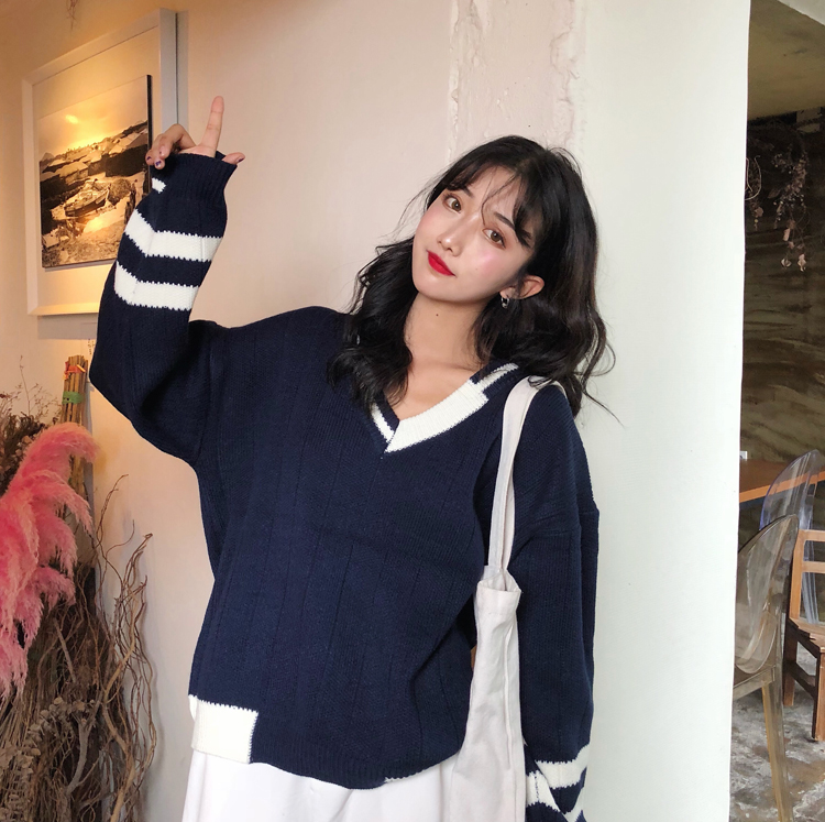 / 秋季女裝韓版寬松氣質撞色V領慵懶風網紅套頭毛衣針織衫上衣外套
