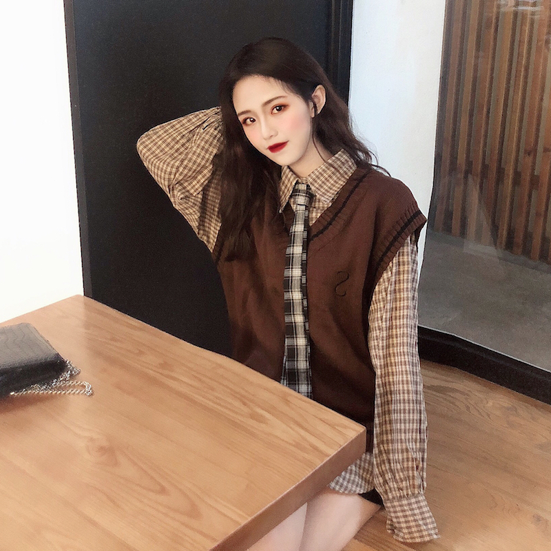 / 女神套裝秋冬新款復古V領字母刺繡毛衣馬甲+燈籠袖格子襯衫帶領帶