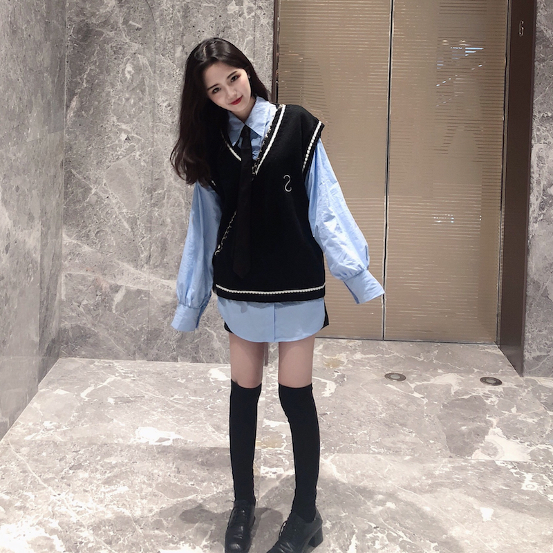 女神套裝秋冬新款復古V領字母刺繡毛衣馬甲+燈籠袖格子襯衫帶領帶