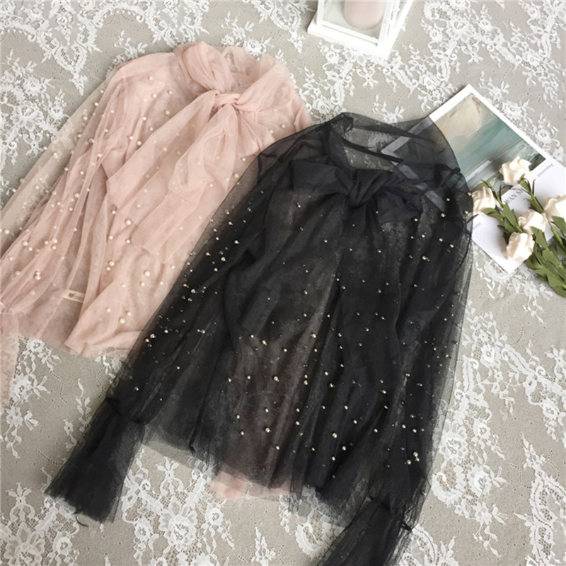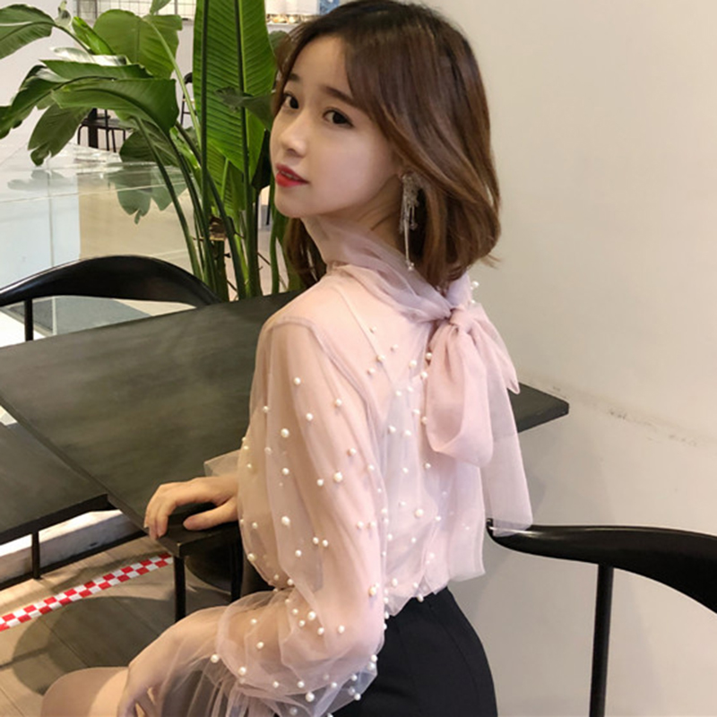 / 早春新款女裝蝴蝶結系帶珠珠荷葉袖網紗上衣+打底吊帶學生兩件套