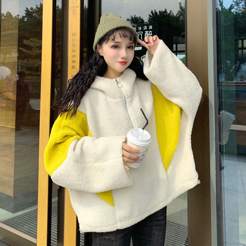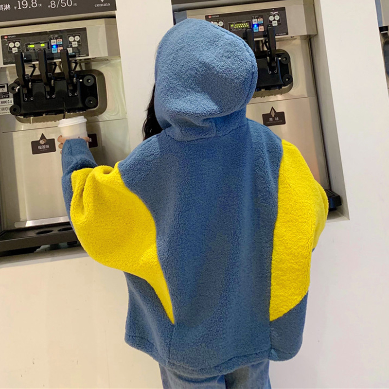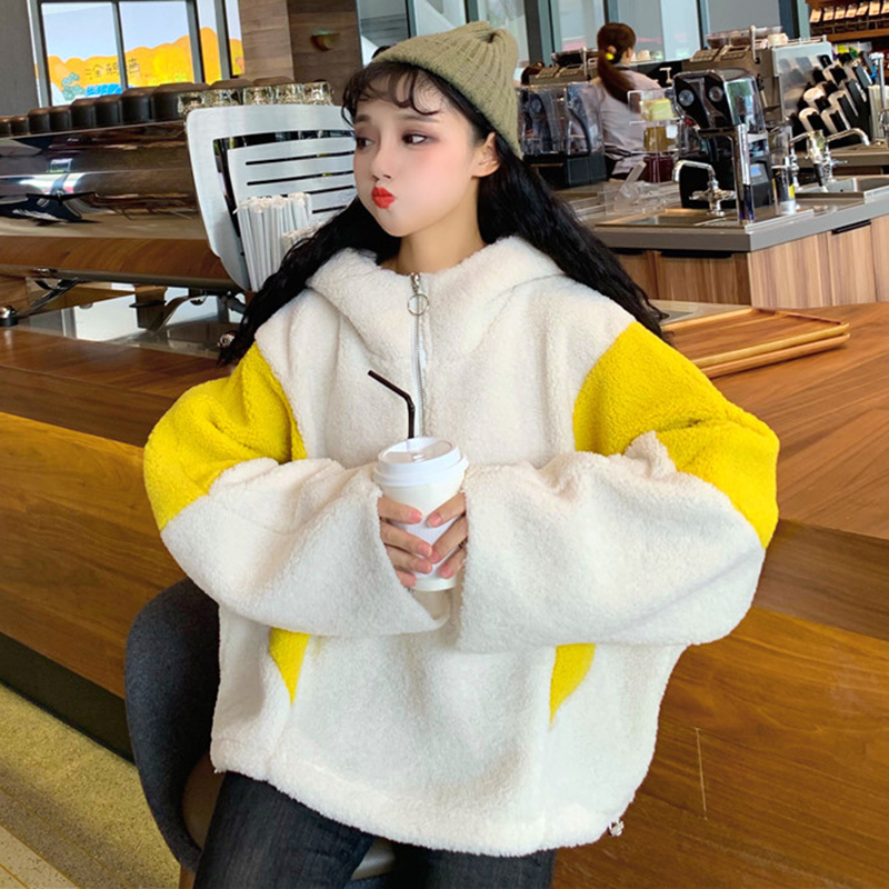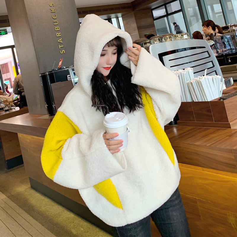 / pp home加絨衛衣女冬裝2018新款韓版拼色下擺抽繩連帽羊羔毛外套