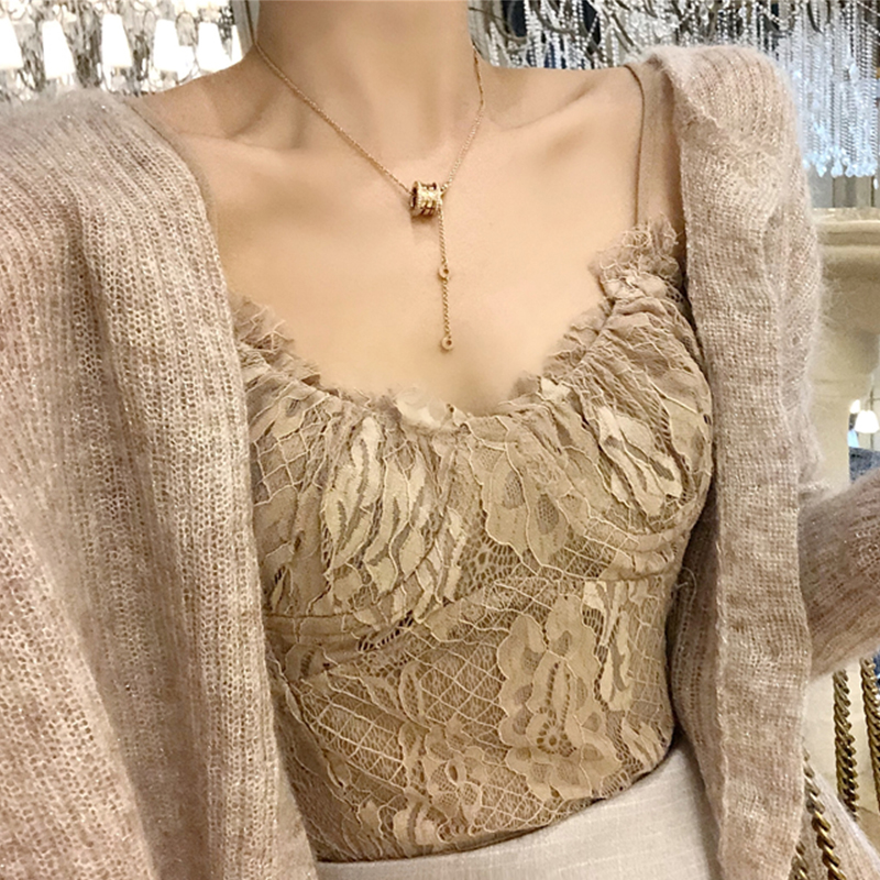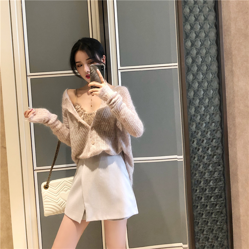 / 2018秋裝新款時尚套裝百搭毛衣開衫復古蕾絲花邊吊帶港味高腰裙褲