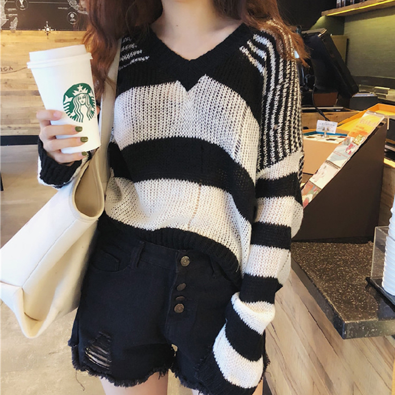 秋裝女2018新款韓版學生寬松V領條紋毛衣慵懶劃破針織衫長袖上衣