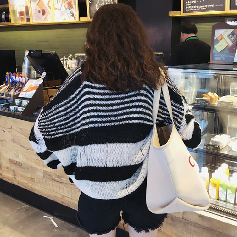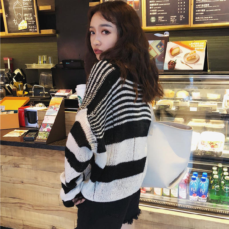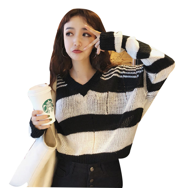 / 秋裝女2018新款韓版學生寬松V領條紋毛衣慵懶劃破針織衫長袖上衣