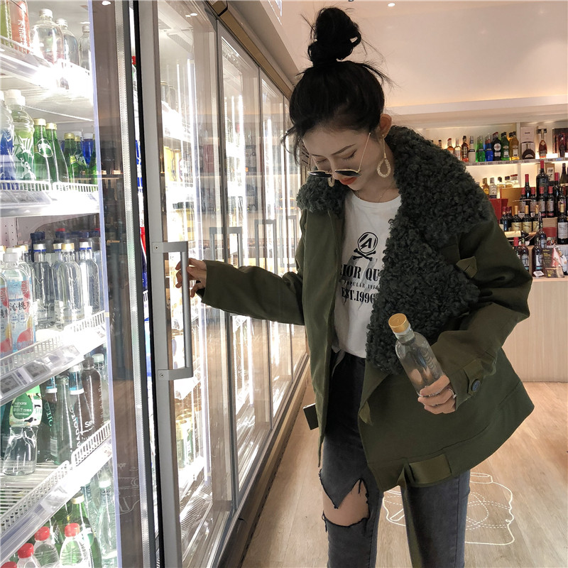 港風外套女冬裝2018新款軍工裝大衣羊羔毛領復古寬松機車加厚棉服