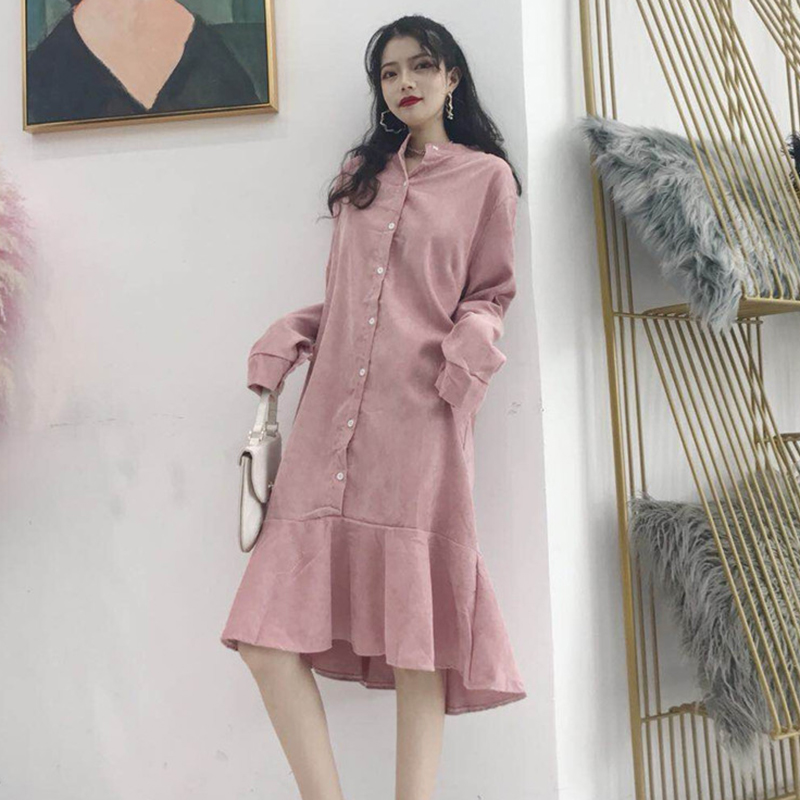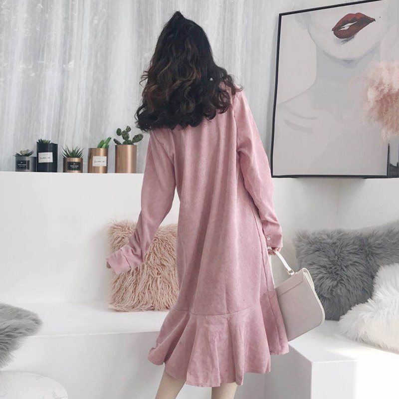 / 法式少女茶歇裙連衣裙秋裝2018新款女長袖扣子寬松魚尾粉色裙子