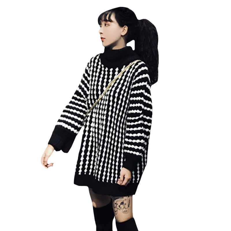 秋冬韓版中長款慵懶風寬松條紋加厚加粗套頭高領毛衣針織衫外套女
