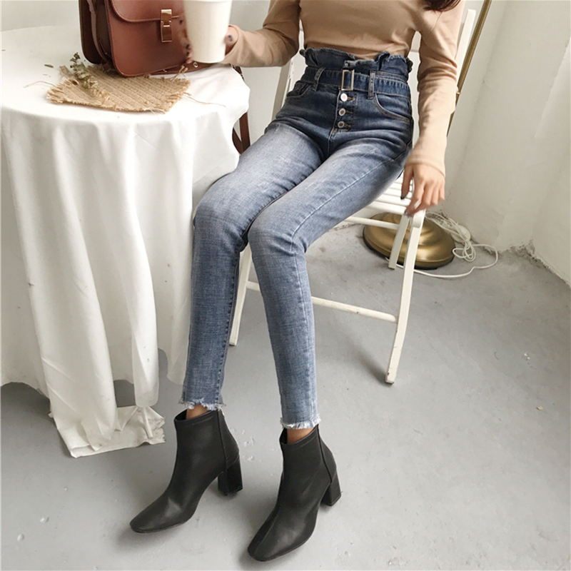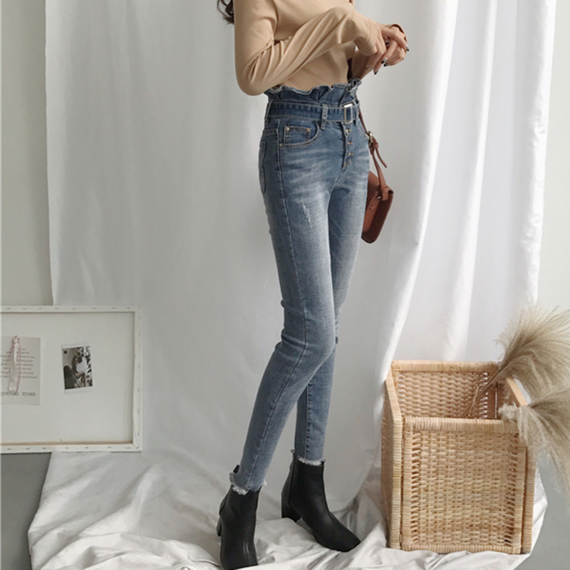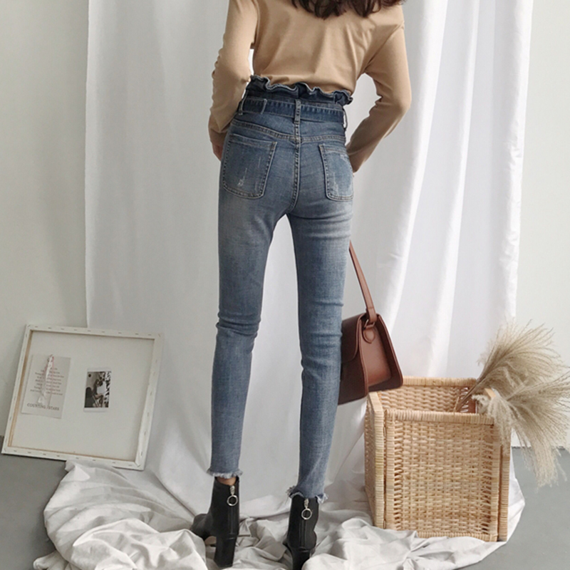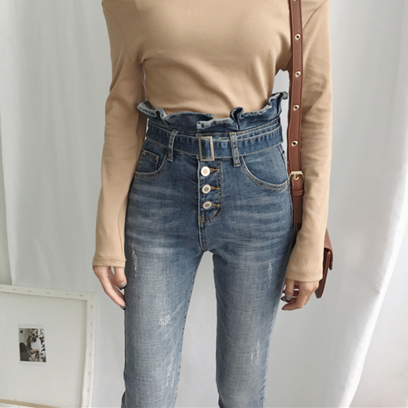 秋裝女2018新款顯瘦荷葉邊彈力高腰牛仔褲學生百搭腰帶撕邊小腳褲