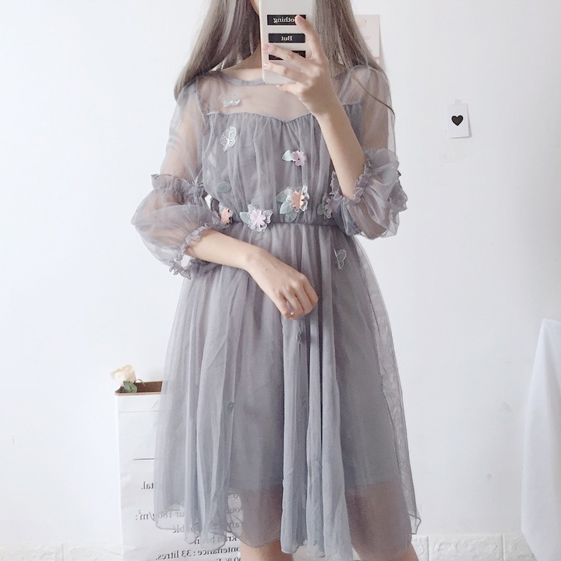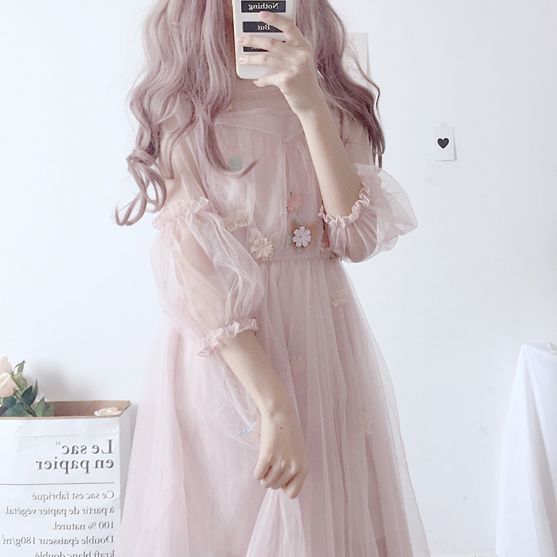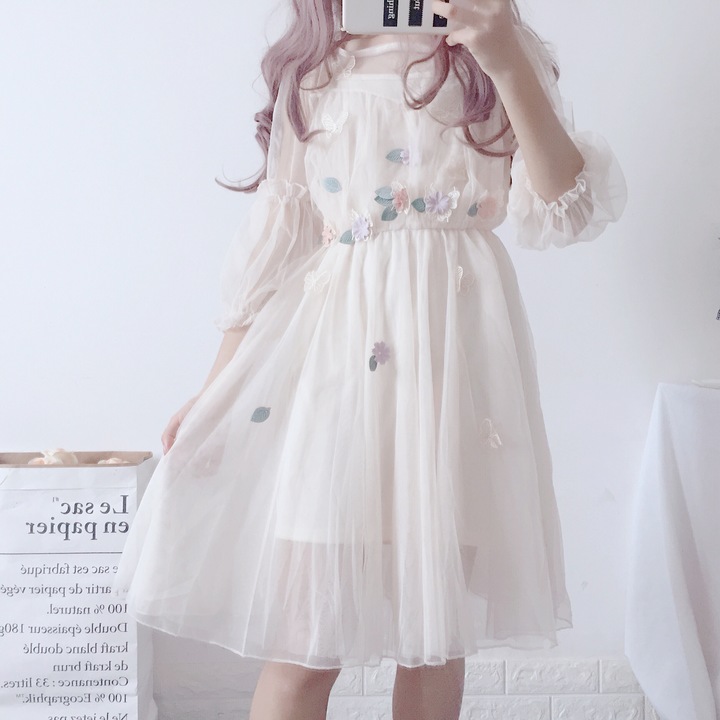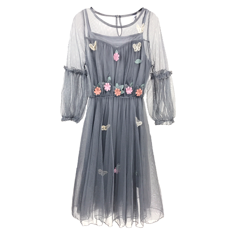 / 新款女裝吊帶裙+日系軟妹甜美燈籠袖網紗連衣裙學生早秋兩件套女