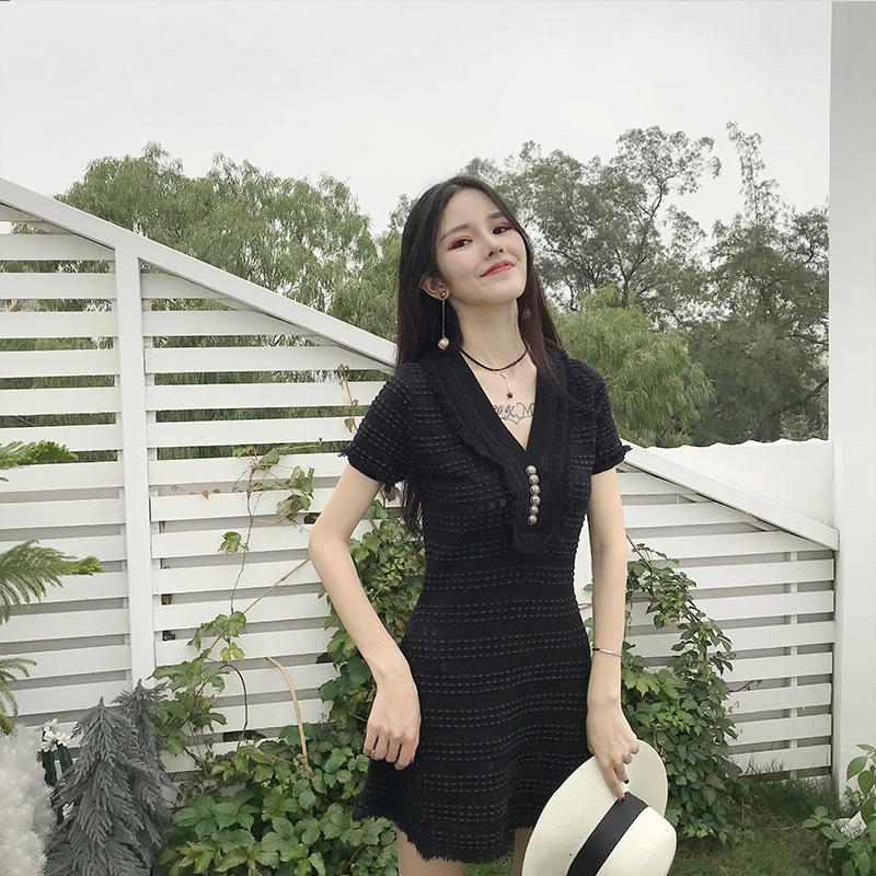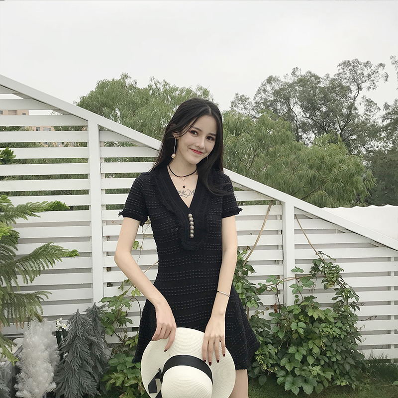 港味復古chic新款韓版百搭純色V領設計感寬松顯瘦中裙時尚連衣裙