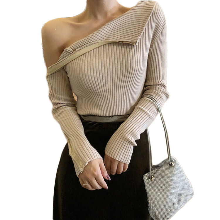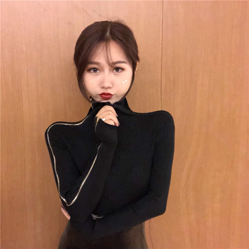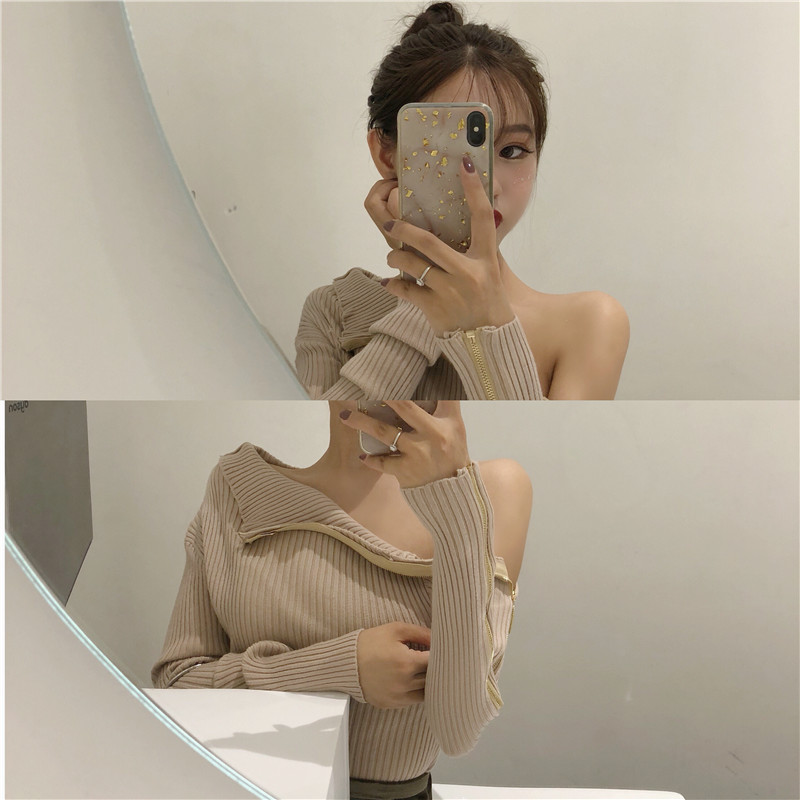 chic早秋毛衣慵懶2018新款女側拉鏈修身打底毛衣純色針織露肩上衣