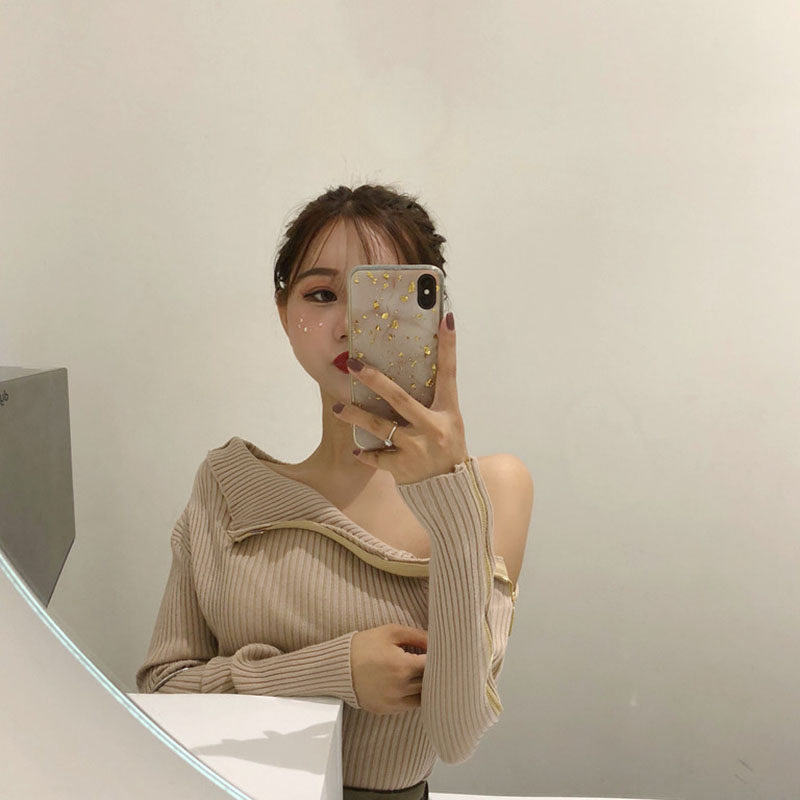 / chic早秋毛衣慵懶2018新款女側拉鏈修身打底毛衣純色針織露肩上衣
