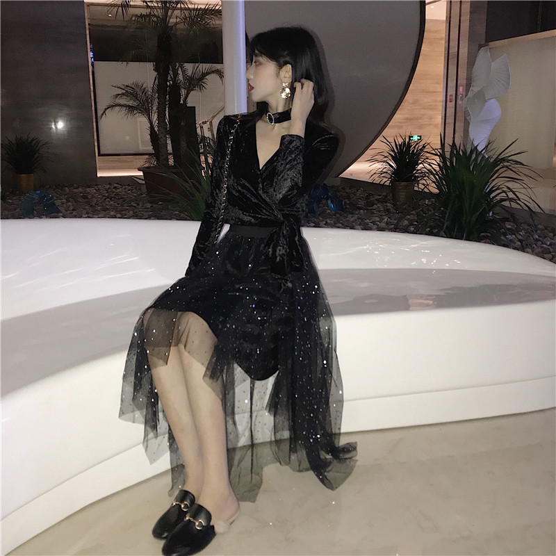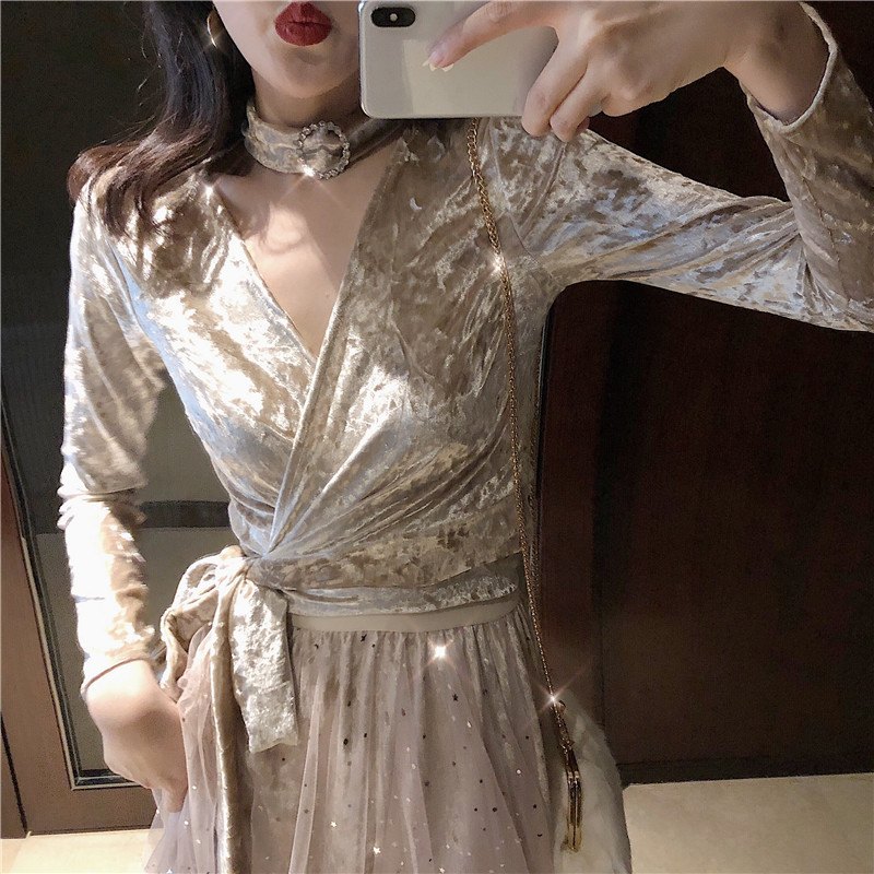 港味2018新款秋冬溫柔風套裝女時尚氣質絲絨上衣網紗半身裙兩件套